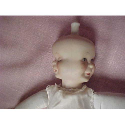 Happy Sleepy Weepy Doll, with ceramic head and arms and cloth body. She has what look like a knob on the top of her head. I am assuming this is to turn the head and swhitch the faces around. This three faced doll is in very good condition. Though she does not have an outfit. She measures approx. 12.5" from top of knob to her toes. I don't know what year this doll was made, but I do know that this doll has been past down from generation to generation for at least 5 to 6 generations.