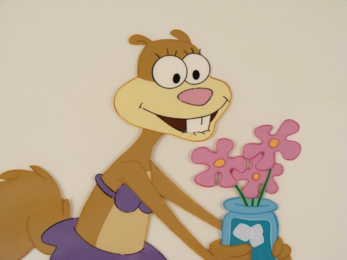 To create production cels, the original animator's drawing is transferred onto an acetate cel (by hand-inking and/or photo copying). The cel is then hand-painted on the reverse side. The cel is ready to be matted and framed. The animator's notations are at the bottom of the cel. The cel has multiple layers; first is the vase with water in it and the second cel is Sandy. There is slight paint fade to Sandy's outline. There is a Nickelodeon TV logo on the bottom left of the cel.