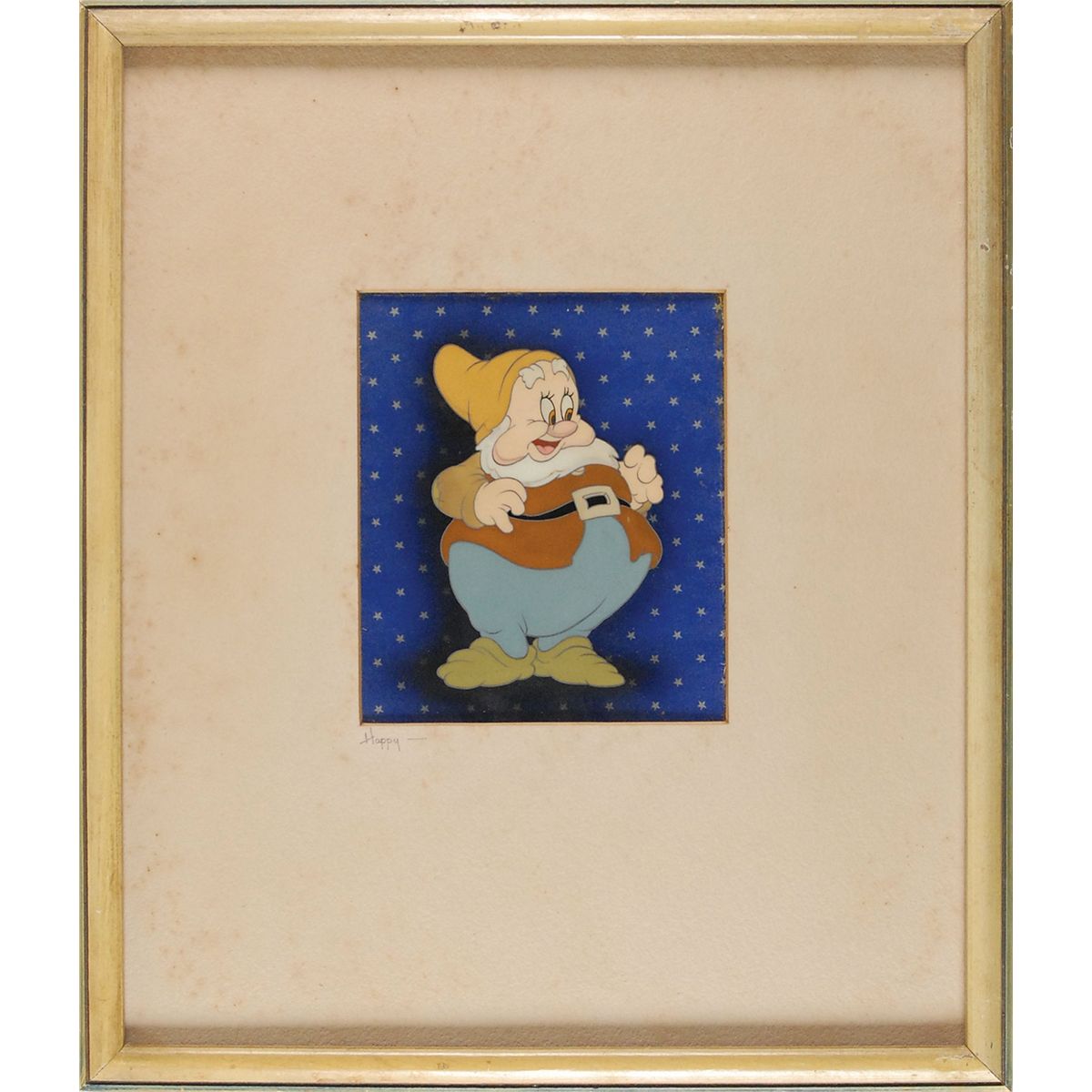 (Walt Disney Studios, 1937) Original production cel featuring Happy from Snow White and the Seven Dwarfs. The cel has been applied to an airbrushed background as prepared by the Disney Studio to be sold at the Courvoisier Galleries. Image measures 2.5 x 4, with a mat opening of 4 x 4.5, with the cream colored mat labeled under the cel “Happy.” This piece is also framed to an overall size of 10.25 x 12. In fine condition, with a bit of mild rippling. Happy was voiced by longtime stage and silent comic actor Otis Harlan, who infused his own jovial personality into the role.