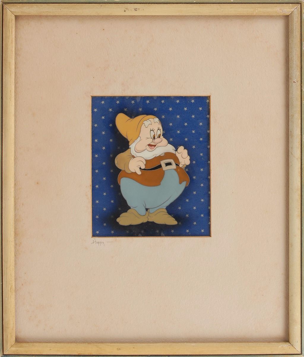 (Walt Disney Studios, 1937) Original production cel featuring Happy the Dwarf from Snow White and the Seven Dwarfs, showing a full-length pose of the dwarf in a naturally jubilant mood. The cel has been applied to a custom star background as prepared by Courvoisier Galleries for sale. Image measures 2.5 x 3.75, with a mat opening of 4 x 4.75. This piece is also framed to an overall size of 10.25 x 12. The piece has the Courvoisier penciled caption below mat opening. Original Munson Gallery frame backing bears an affixed Walt Disney label, “This is an original painting on celluloid from the Walt Disney Studios, actually used in the filming of ‘Snow White and the Seven Dwarfs.’ Only a very limited number have been selected to be placed on the market.” In fine condition.