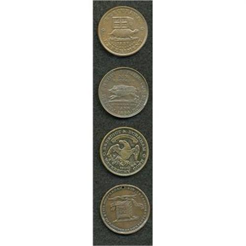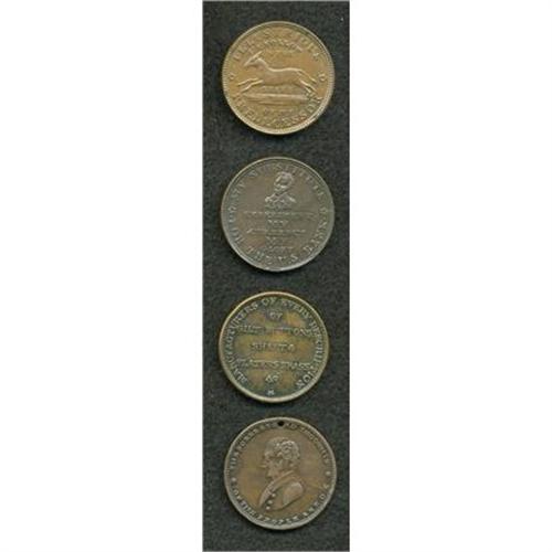 <B>Hard Times Token Quartet.</B></I> Copper. Includes: <B>Running Boar, HT-9, XF; Illustrious Predecessor, HT-33, VF+; Martin Van Buren, HT-75, VF; </B></I>and<B> Benedict & Burnham, HT-104, VF+. </B></I>A nice lot.<B></B></I><BR><BR><b>Shipping:</b> Coins & Currency (<a target="_blank" href="http://www.heritageauctions.com/common/shipping.php">view shipping information</a>)