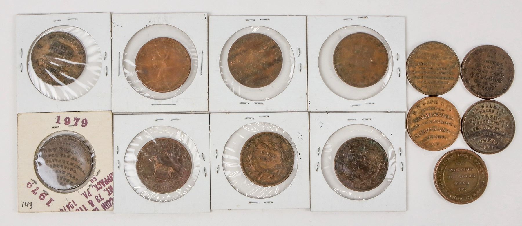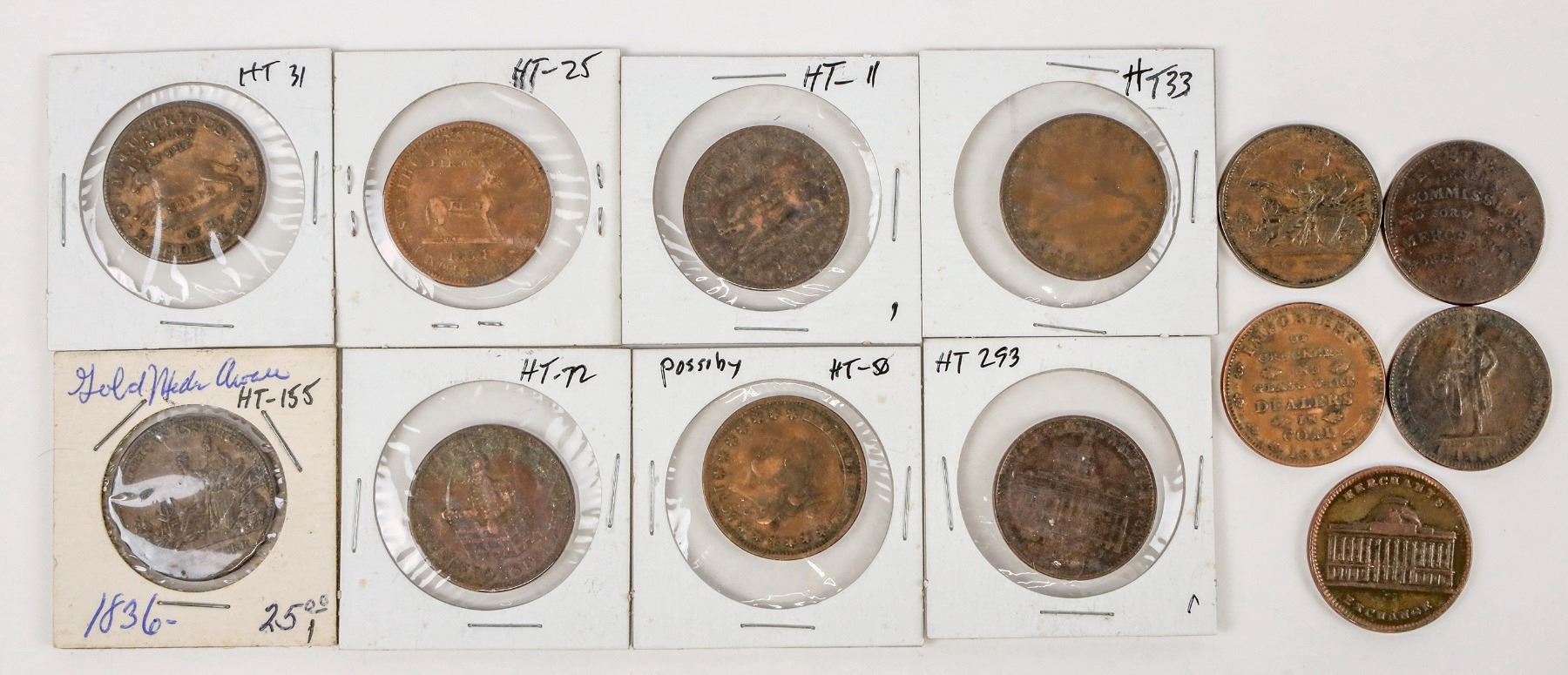 Twelve different Hard Times tokens (1830s): HT 11, 25, 31, 33, 72, 143, 153, 155, 174, 195 (2), 293, 294.
