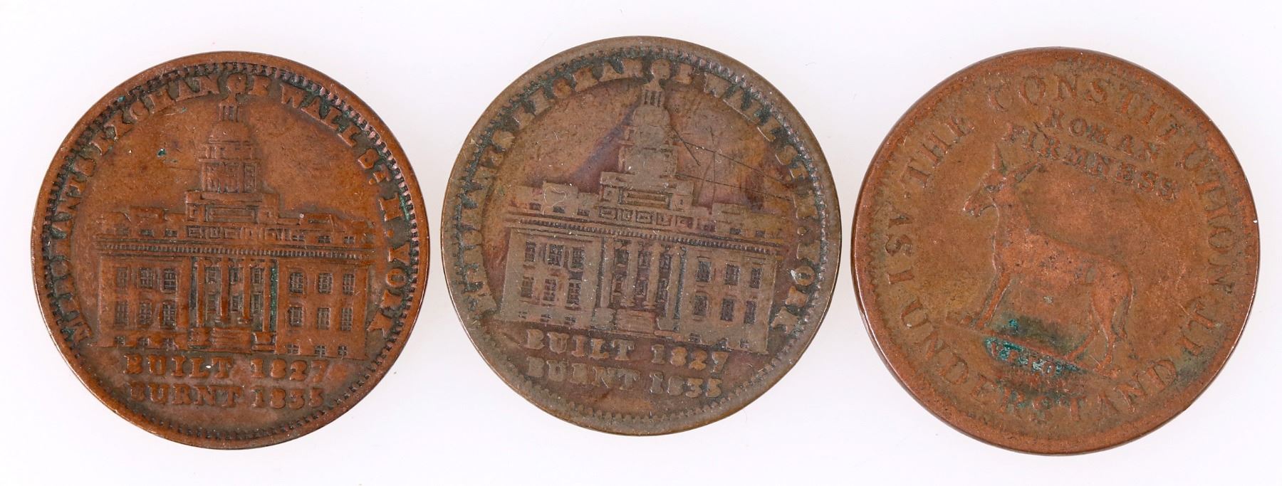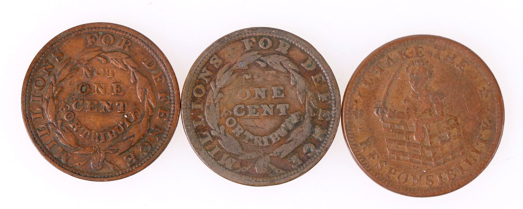 Three Hard Times tokens: two HT-293: Millions For Defense Not One Cent In Tribute; HT-72: I Take The Responsibility.