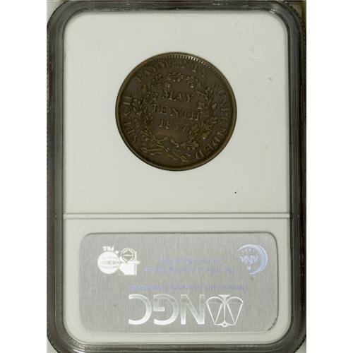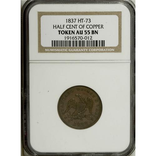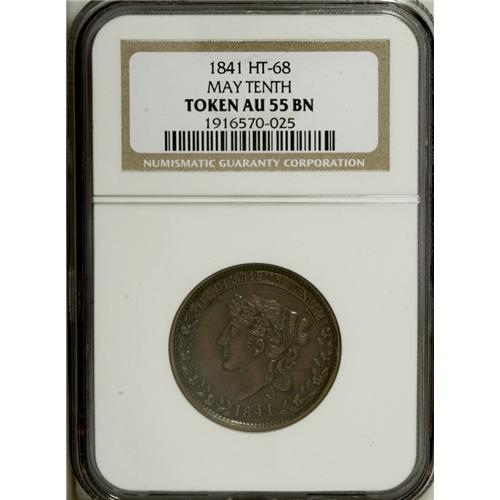 <B>Hard Times Two-Token Lot, NGC-Certified.</B></I> Contains an <B>1841 May Tenth, AU55 NGC,</B></I> Low-67, HT-68, a well-struck olive-brown example; and an <B>1837 Half Cent Worth of Pure Copper AU55 NGC,</B></I> Low-49, HT-73, R.1, a lustrous and sharp medium-brown piece. Current catalog value ranges from about $375 to $425.<BR><BR><b>Shipping:</b> Coin/Currency (<a target="_blank" href="http://www.heritageauctions.com/common/shipping.php">view shipping information</a>)