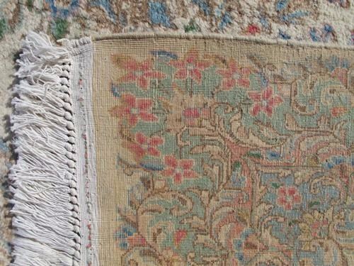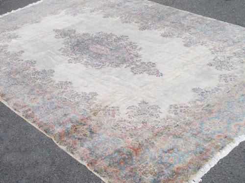 Rug: Authentic Large Room Size Handmade Semi Antique Persian Kerman; Material: Fine quality baby lamb's wool pile, all natural vegetable dye; Size: 11 X 19.11 feet; Foundation: Cotton; Design: Persian Kerman; Origin: Iran;