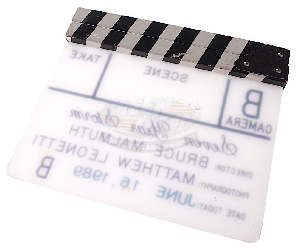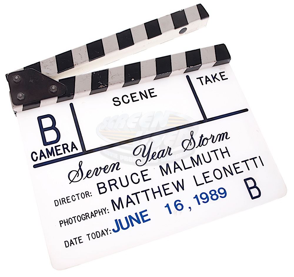 (Warner Bros., 1990) This clapper board was custom-made by the production for use during filming. The clapper board features the films working title "Seven Year Storm" and was wiped clean after filming. The clapper board still shows signs of use and measures 11" x 9.25".