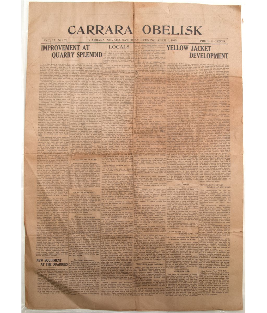 1915 Carrara Obsession. Carrara Quarry improved and Yellow Jacket is being developed. As with all old newspapers the paper is very fragile, but the historical value in articles and advertising is tremendous. Due to size, additional shipping fees may be required.