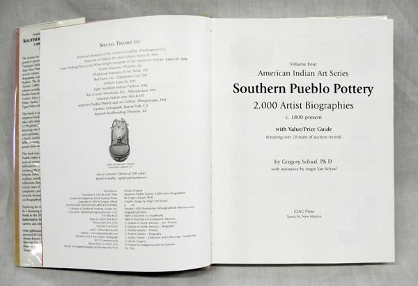 From the Collection of Nick and Suzanne Nicholas. Hardback Book Southern Pueblo: 2,000 Artist Biographies by Gregory Schaff, measures 9 in. x 11 in., comes in book jacket