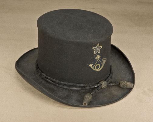 Hardee-style Officer’s hat, dark blue felt showing star and bugle with original-to-the-period hat cord, possibly Militia or GAR. The hat is in good condition, the crown very good, the brim shows muchsweat staining and wearing; some tears and small repairs. The interior sweat leather band has been re-stitched and generally good overall. The emblems appear to be original to the body. Hat was a commercial top hat ofthe Civil War era. Est.: $1,000-$3,000.