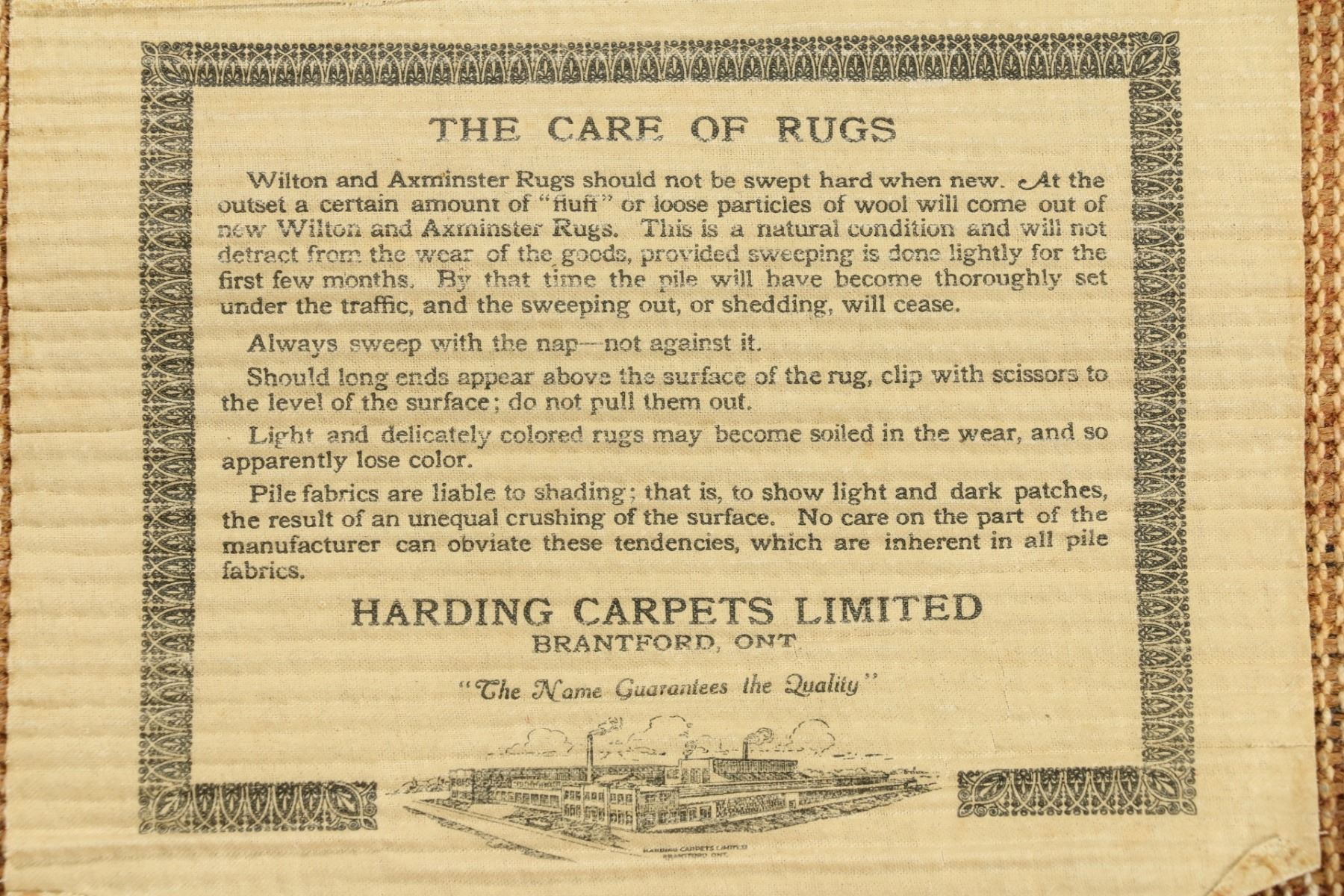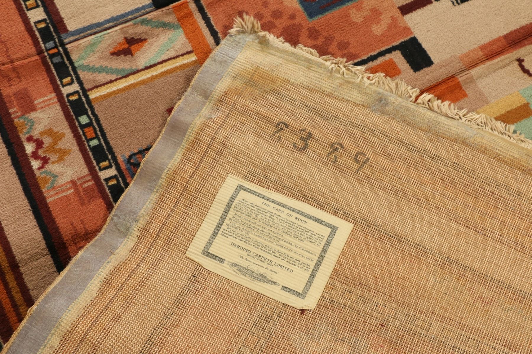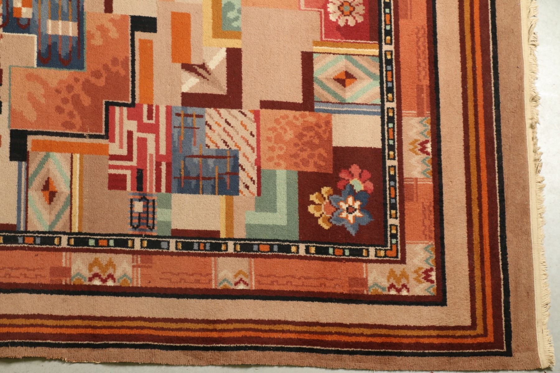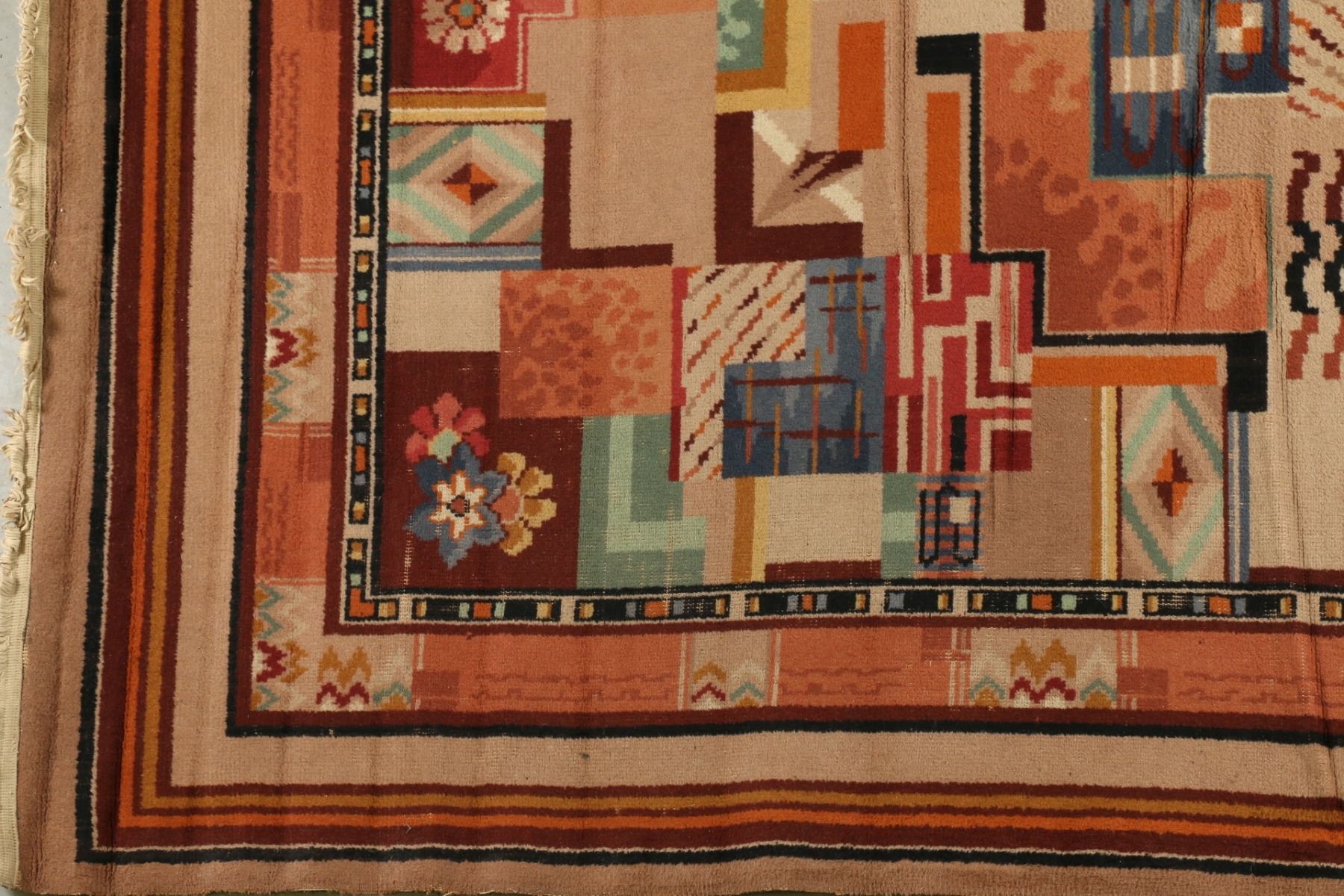 Lot 182 - Harding machine made rug. Art deco. Creasing, requires cleaning. 121" x 80.25". $300-500.