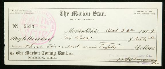 Harding, Warren G (1865-1923) 29th President of the United States (1921-1923). Check signed ("W G Harding") as president of The Marion Star, the newspaper bought by Harding in 1884, 3¼ x 8", Marion, Ohio, Oct. 25, 1909. Written on The Marion County Bank Co. to the order of Pay Roll, in the amount of $350.00. With his wife, Florence, as circulation manager, the Star became quite successful and was one of the first newspapers to offer profit sharing to its employees. Accomplished and signed by Harding. Fine. Accompanied by an engraving of Harding.