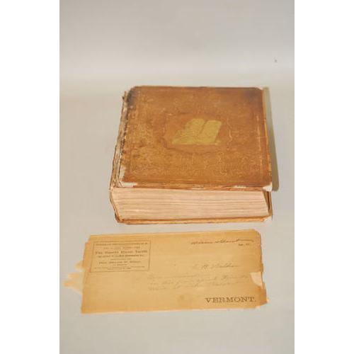 Harding's Fine Edition - The Holy Bible Containing The Old and New Testaments... WITH ENVELOPED LAID-IN CONTAINING COMMUNICATION WITH SPIRIT FRIENDS WHILE AT LAKE PLEASANT. Philadelphia: Jesper Harding, 1854. 4to - over 9¾" - 12" tall. Full-Leather. Fair to Good condition. Tooled leather covers, with gilt still bright. Covers detached, backstrip chipping & peeling. BINDING TIGHT. Spirit writing on carbon sheets, with handwritten copy for easy reading.