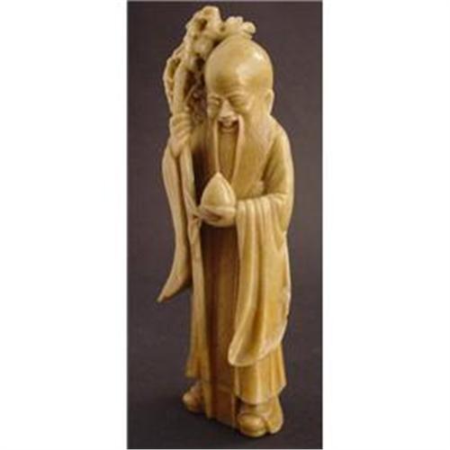 <table width="100%" border="0" cellspacing="0" cellpadding="4"><tr><td><em> God of Good Luck!</em></td></tr><tr> <td width="100%"> Carved green Hardstone figure of one of the seven Chinese lucky Gods. Jurojin, associated with longevity, is depicted as an old man, with a friendly smile, carrying a stick in one hand and the peach of longevity in the other. In good condition with losses, as shown. Additional photos available upon request. Please send us an email before bidding with your state, country and zip code so we can estimate shipping charges to your location.
