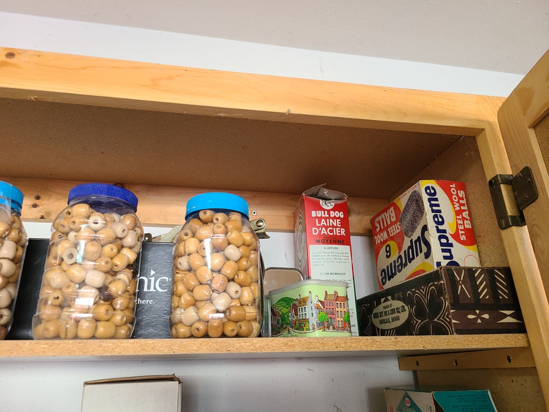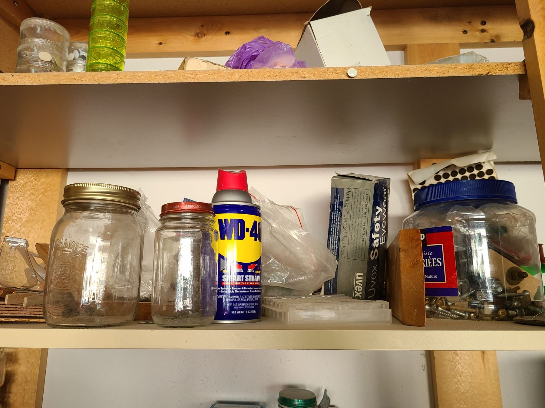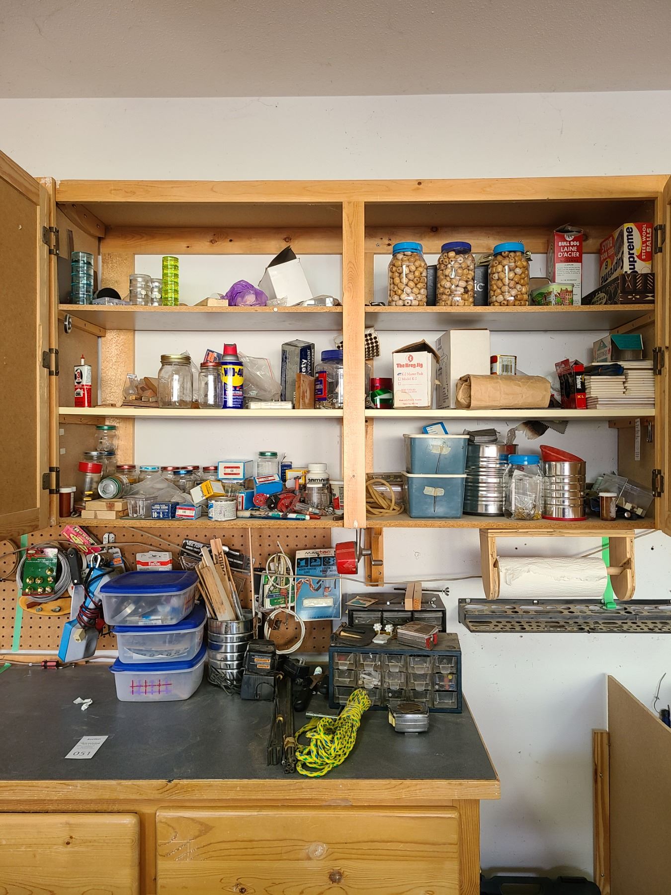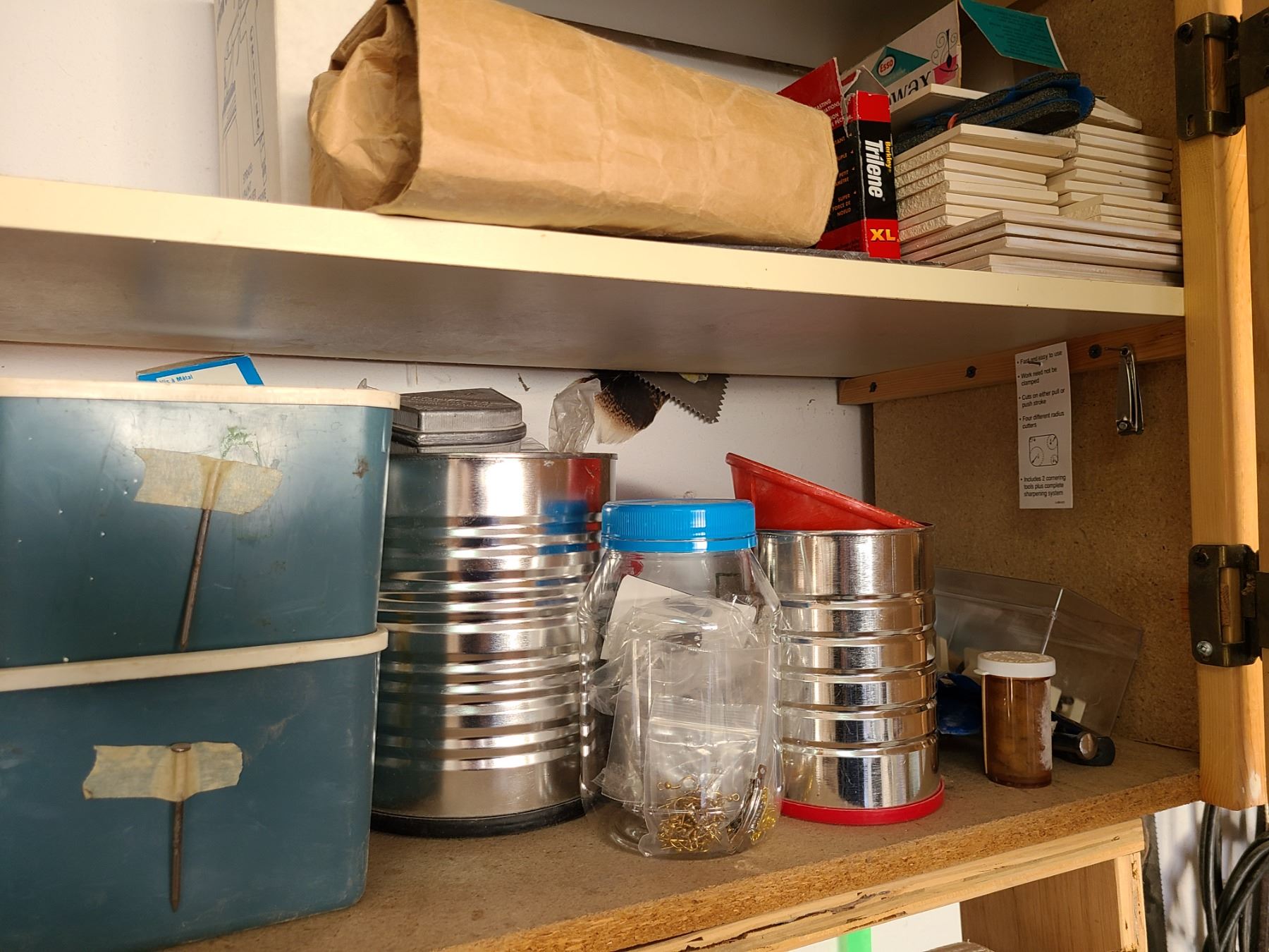 Lot includes storage bins, small hardware items, and small parts on counter top. Bring boxes. Pickup 9 am.