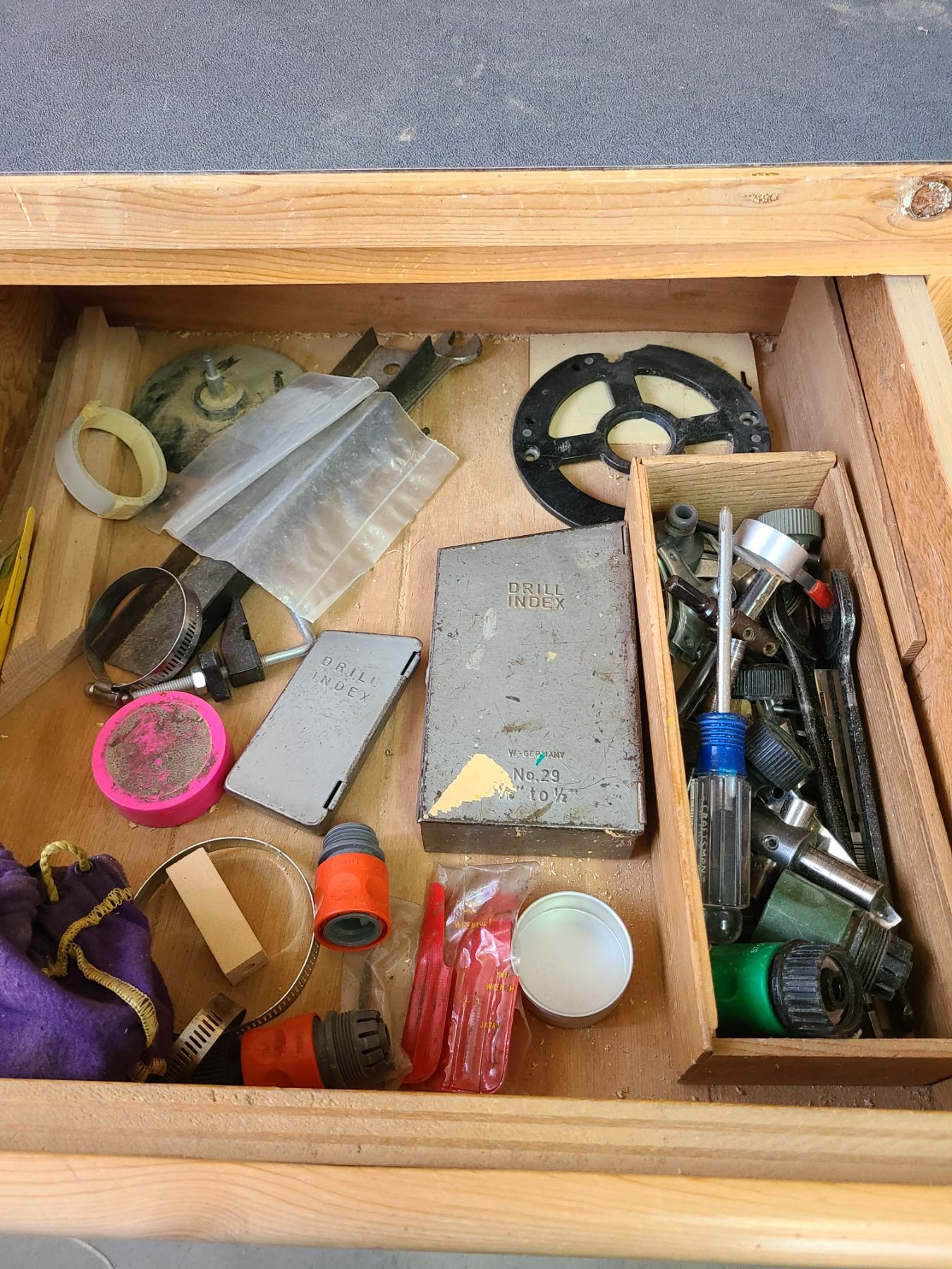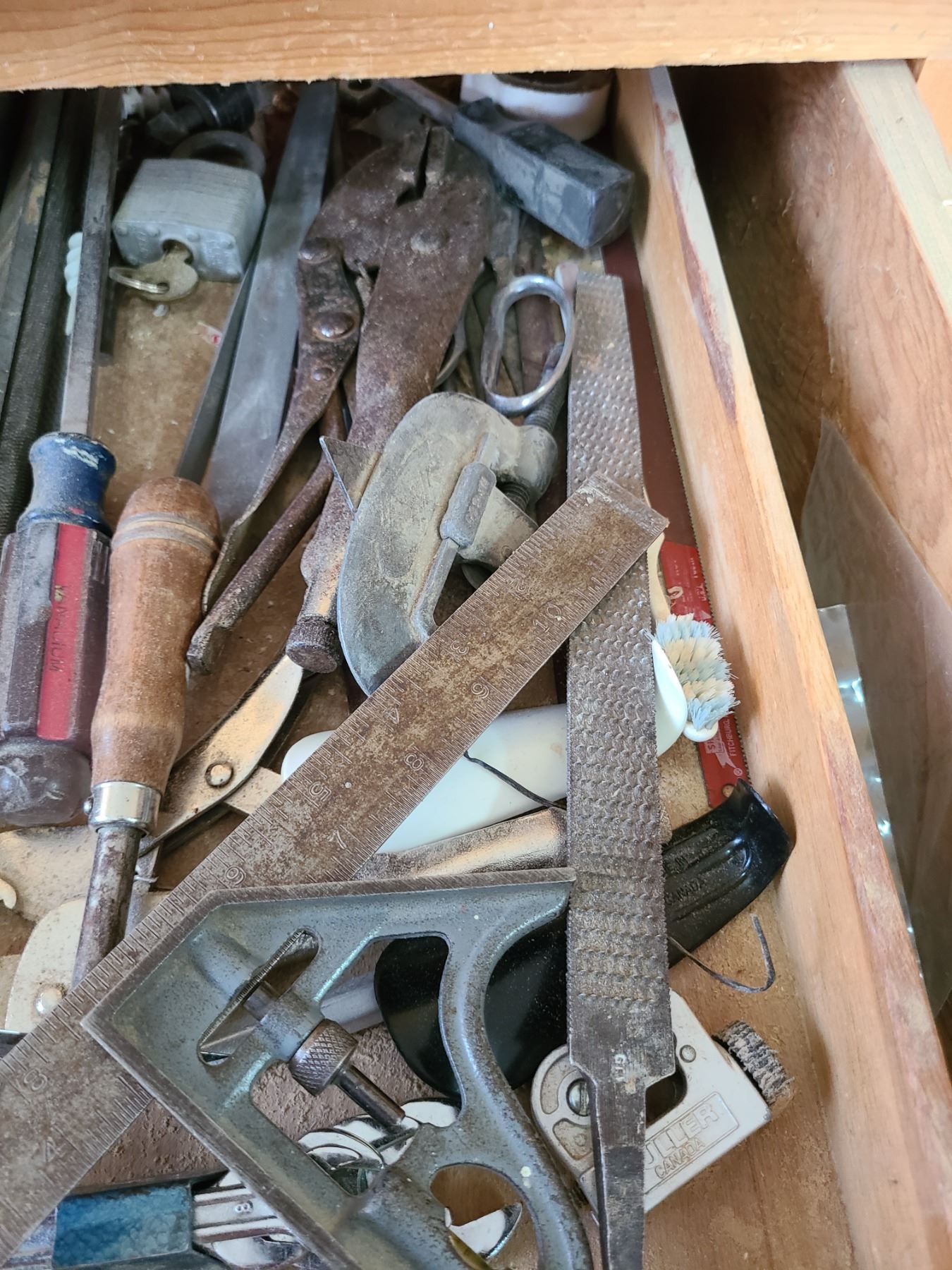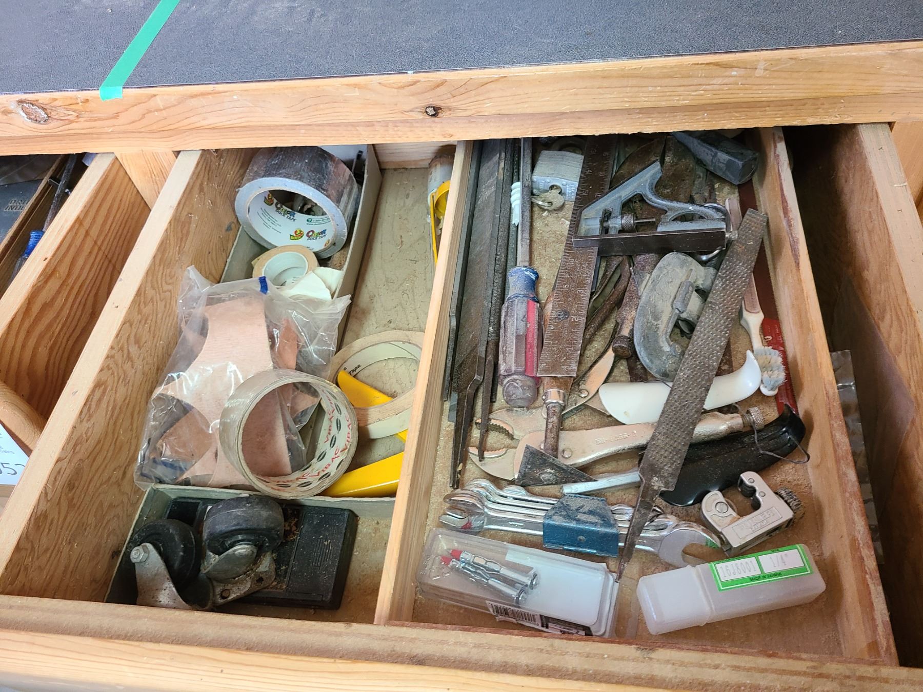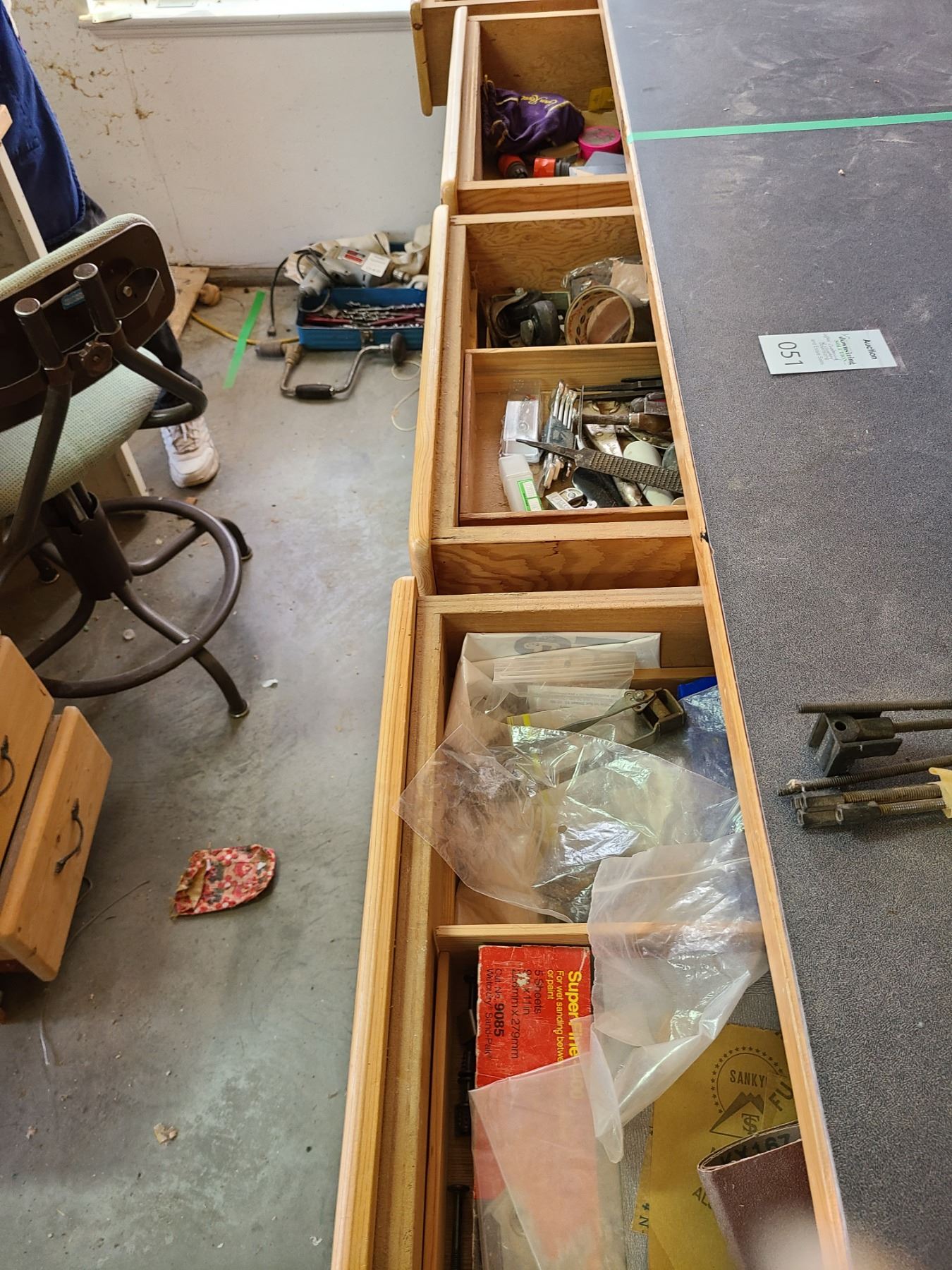Four drawers of small carpentry items including tools. Bring boxes. Pickup 9 am.