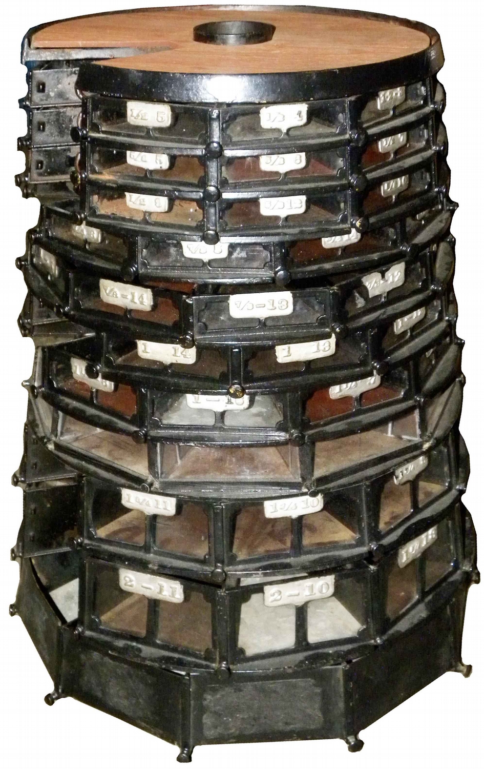 Hardware Bolt Cabinet. Iron and wood construction. Very good condition. 17 inch diameter X 24 inches tall.