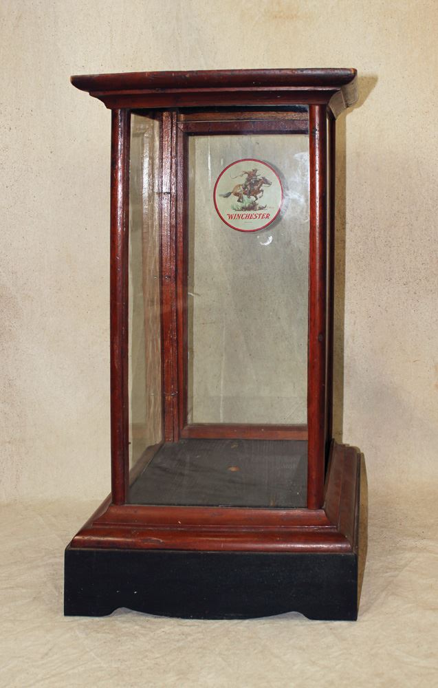 A nice turn of the century store fixture counter top showcase with a Winchester advertising label in the back glass, three glass shelves, and measures 26" tall.
