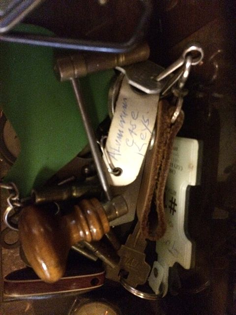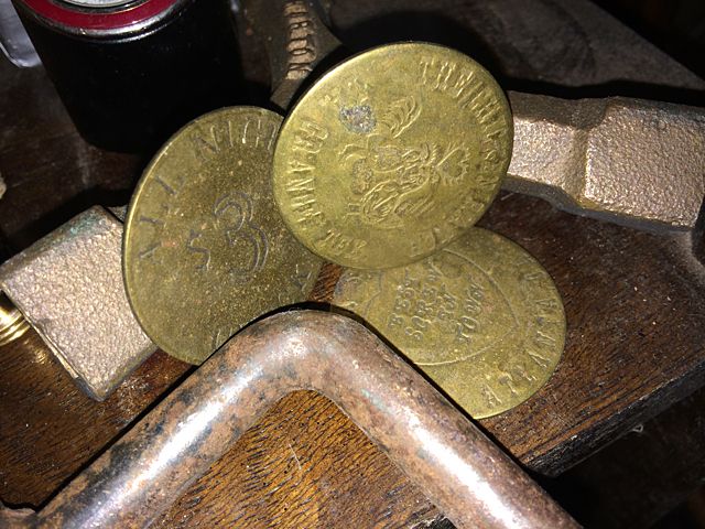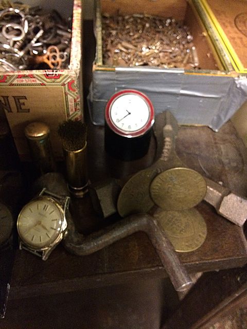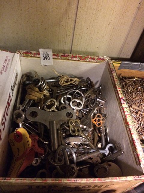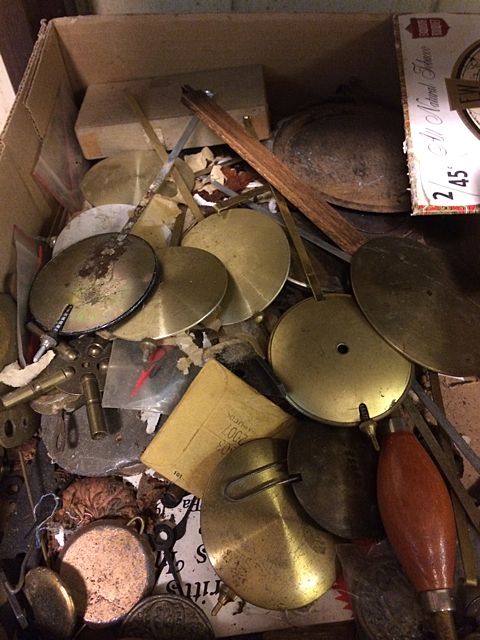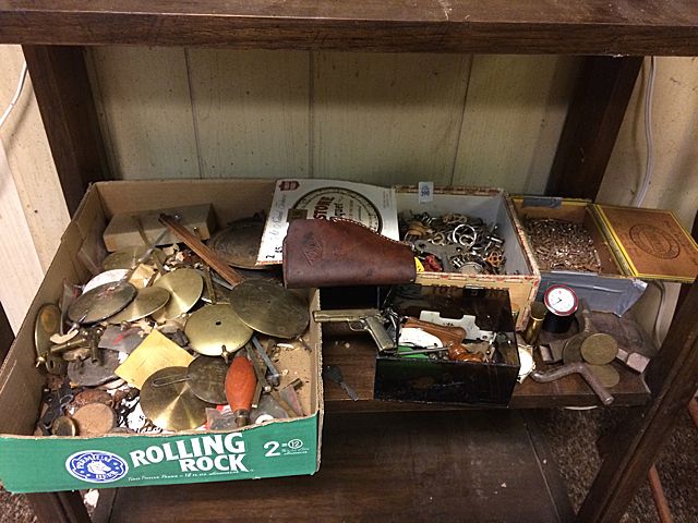 Lot of clock parts and pendulumns, keys, small screws (some may fit watches, etc.), wrenches, 3 brass tokens from "The Chicken Ranch, LeGrange, TX", Swiss Army clock, wire brush, gun belt buckle, gun holster,Seth Thomas #2 Wall Regulator brass weight (very hard to come by), etc. These items may be picked up in Torrington, CT. Appointment time will be scheduled after auction date.