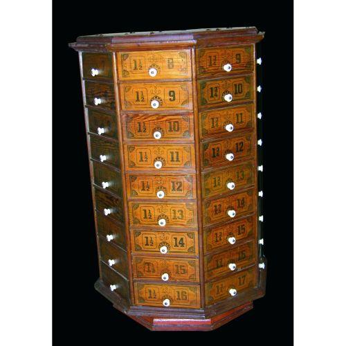 Hardware Store Bolt Cabinet. Original porcelain pulls with 72 drawers. All original excellent condition. 22 inch diameter X 33 inches tall