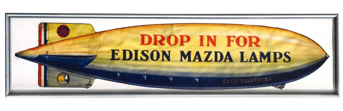 Hardware store sign, Edison Mazda Lamps, framed paper zephyr w/GE logo on tail, unique w/great color, overall VG cond w/orig fold lines, minor restoration on upper tail & bottom, minor spotting that doesn't detract from its fun image, 13"H x 49.5"W.