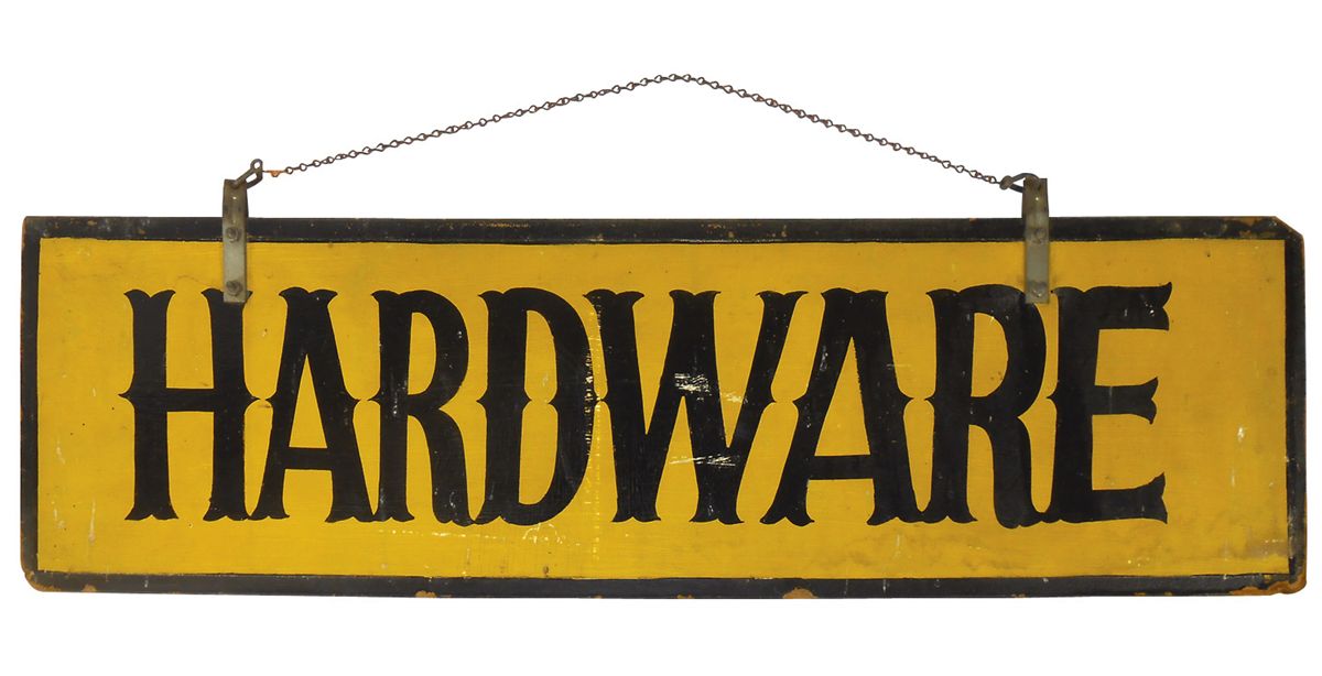 Hardware store sign, heavy fiberboard 2-sided hanging sign from old Iowa hardware store, orig metal hangers w/chain, VG cond, 13"H x 43.5"W.