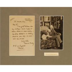 ALs dated, 26 December, 1924. "Dear Sir, I am glad to hear my writings - which I infer to mean those in verse mainly - are to be studies in literary club in your city, to which I wish all success. Yours truly Thomas Hardy." The receipient of the letter being Dr. C.M. Singleton of Toronto. Framed with a later photomechanical portrait of Hardy.