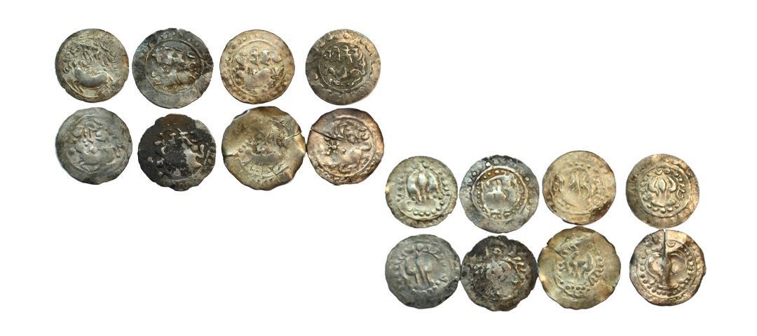 Harikelas, Eastern Bengal, (7th-9th Century AD), Set of 8, Silver Unit, 5.10 to 5.50 gms, Obv. A bull seated to left, Garland around its neck, Early Nagari legend ‘(Ha)rikela’ on top, Circular and beaded borders around, Rev. An ornate Tripatriate (Shrivatsa?) symbol with Sun and Moon on top, Circular and beaded borders around, fine to very fine, very scarce.