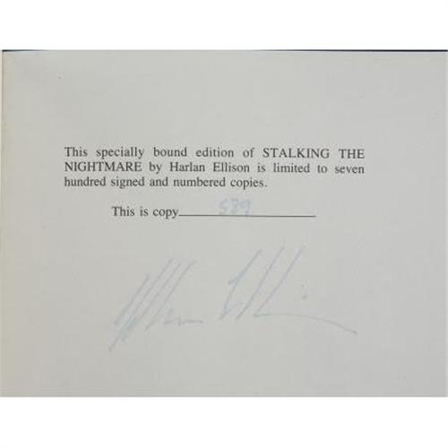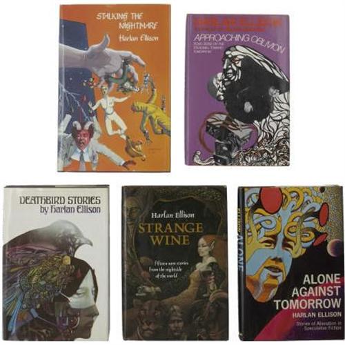 <B>Harlan Ellison</B></I>. <B>Five First Editions</B></I>, including: <B><I>Alone Against Tomorrow</B></I></B></I>. New York: The MacMillan Company [1971]. Octavo. 312 pages. Brown cloth with gold spine titles. Overall, book and dust jacket are fine. [and:] <B><I>Approaching Oblivion</B></I></B></I>. New York: Walker and Company, 1974. Octavo. 238 pages. Orange binding with black spine titles. Overall, book and dust jacket are fine. <B><I>Deathbird Stories</B></I></B></I>. New York: Harper and Row, Publishers [1975]. Octavo. 334 pages, untrimmed. Quarter purple cloth over gray paper boards. Gilt spine titles. Overall, book and dust jacket are fine. [and:] <B><I>Strange Wine</B></I></B></I>. New York: Harper and Row, Publishers [1978]. Octavo. 262 pages. Quarter red cloth over brown paper boards. Gilt spine titles. Book and dust jacket are fine. [and:] <B><I>Stalking the Nightmare</B></I></B></I>. Huntington Woods, Michigan: Phantasia Press [1982]. Special slipcase edition numbered 589 of 700 copies. Octavo. 332 pages. Blue cloth with gilt titles on spine and front cover. Overall, very fine (unread). Slipcase is fine with minor rubbing. <I>From the Robert and Diane Yaspan Collection.</B></I><BR><BR><b>Shipping:</b> Books & Catalogs (<a target="_blank" href="http://www.heritageauctions.com/common/shipping.php">view shipping information</a>)