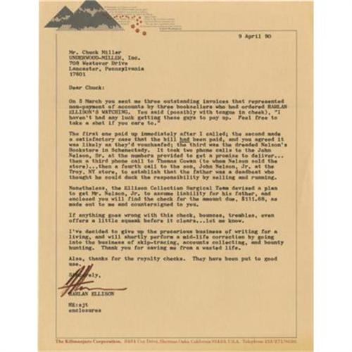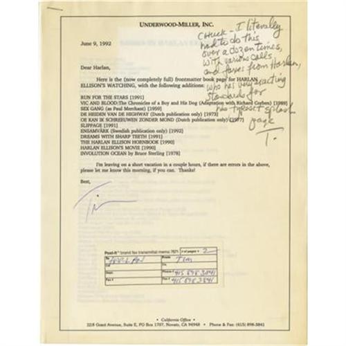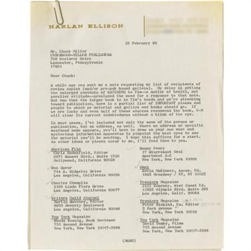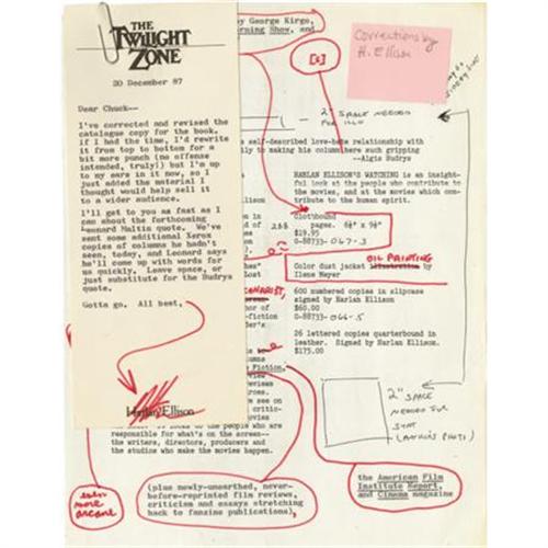 <B>Harlan Ellison: Production Archive for <I>Harlan Ellison's Watching</B></I>.</B></I> Several manila folders of material relating to the publication of <I>Harlan Ellison's Watching,</B></I> a book of film reviews and essays 25 years in the making, and published in 1989. Includes a number of signed letters back and forth between Ellison and the publisher, Underwood-Miller, including a typed letter signed "<I>Harlan</B></I>" on Ellison's personal stationery. The archive also includes various states of the colophon page, two copies of the original photograph used on the dust jacket flap, a proof of the dust jacket eventually used on the book, a manila folder jammed pack with reviews of Ellison's work and articles on his talents as a writer and as a social critic. The reviews also include several newspaper clippings and magazine articles on Ellison. Additionally, the archive includes promotional material, with several states of a one-page advertisement with holographic corrections, presumably in Ellison's hand. A letter of provenance signed by Charles F. Miller of Underwood-Miller, Inc. accompanies this lot.<BR><BR><b>Shipping:</b> Flat Material, Small (<a target="_blank" href="http://www.heritageauctions.com/common/shipping.php">view shipping information</a>)