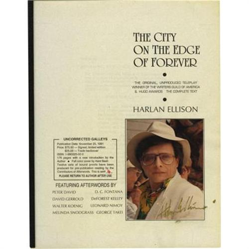 <B>Harlan Ellison: Signed Bound Proof of </B></I><I>The City on the Edge of Forever.</B></I> 94 pages, bracket-bound with a clear cover, 8.5" x 11". An uncorrected galley of the original, unproduced teleplay that won the Writers Guild of America and Hugo awards. Numbered 4 of 12 sets of bound proofs produced for pre-publication reading by the writers of the Afterwords. A photo of Ellison signed "<I>Harlan Ellison</B></I>" is affixed to the front cover. <I>The City on the Edge of Forever</B></I> was the penultimate episode of <I>Star Trek</B></I>'s first season, but Ellison's script was heavily edited by the show's producers. The screenplay presented here represents Ellison's original vision for the story.<BR><BR><b>Shipping:</b> Books & Catalogs (<a target="_blank" href="http://www.heritageauctions.com/common/shipping.php">view shipping information</a>)