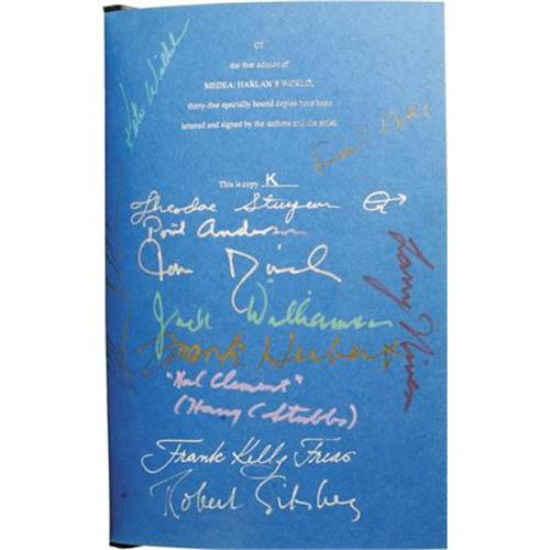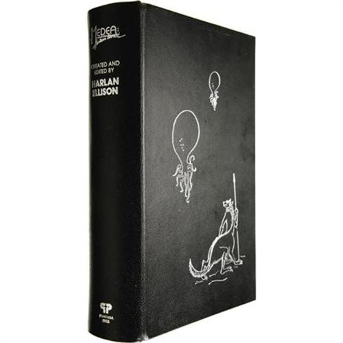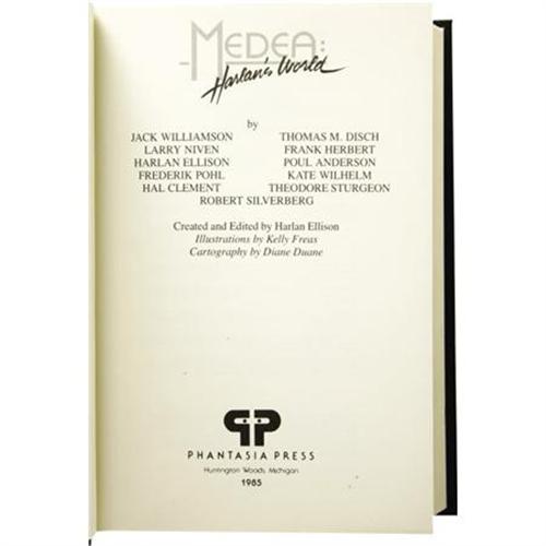 <B>Harlan Ellison (editor): Signed Lettered Edition of <I>Medea: Harlan's World</B></I></B></I> (Huntington Woods, Michigan: Phantasia Press, 1985), first edition, 532 pages plus limitation page signed by all of the authors and the artist, black morocco binding with silver lettering on the spine and front board, blue foil endpapers, 8vo (6.25" x 9.5"), no dust jacket (as issued). Illustrations by Kelly Freas and maps by Diane Duane. Lettered K of 35 lettered copies. Signed by all 11 authors including Poul Anderson, Hal Clement, Thomas M. Disch, Harlan Ellison, Frank Herbert, Larry Niven, Frederik Pohl, Robert Silverberg, Theodore Sturgeon, Kate Wilhelm, and Jack Williamson and illustrator Kelly Freas. The book is as new, with no noticeable flaws present. A magnificent and rare lettered copy of <I>Medea</B></I> signed by all 11 authors.<BR><BR><b>Shipping:</b> Books & Catalogs (<a target="_blank" href="http://www.heritageauctions.com/common/shipping.php">view shipping information</a>)
