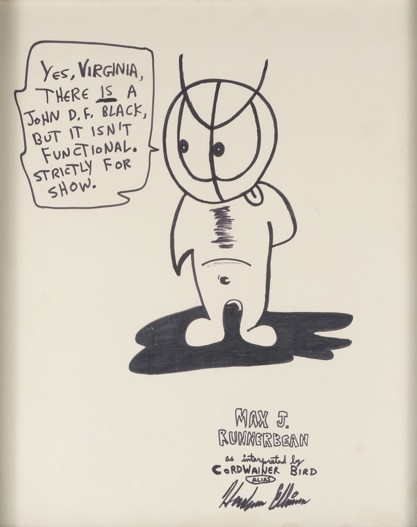 373. Harlan Ellison large cartoon artwork to Star Trek associate producer John D.F. Black. (ca. 1960s-1970s) Vintage original cartoon drawing by legendary and visionary sci-fi author Harlan Ellison to John D. F. Black. accomplished in black marker pen on 21 x 25 in. artists board. The renowned combative wit has written in his cartoon character's speech bubble, "Yes, Virginia, there IS a John D. F. Black, but it isn't functional. Strictly for show" and Ellison has captioned the piece, "Max J. Runnerbean as interpreted by Cordwainer Bird alias..." and signed, "Harlan Ellison". Exhibiting minor age and light toning. In vintage very good condition. $600 - $800
