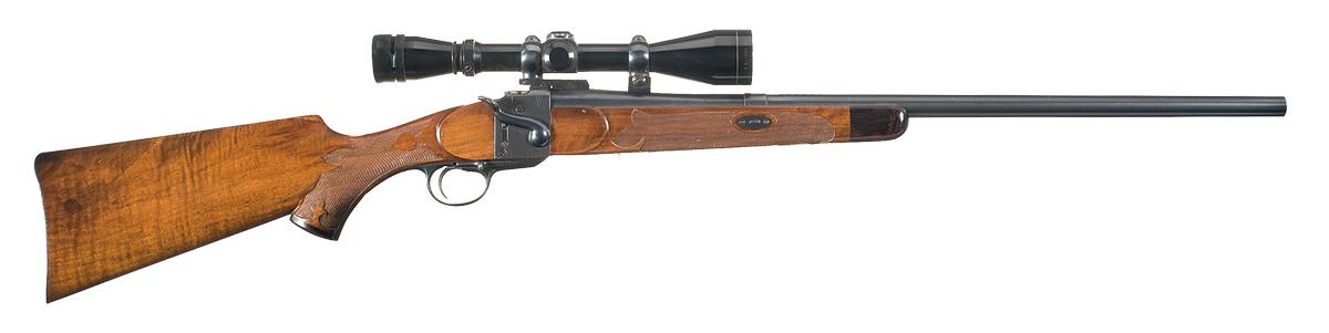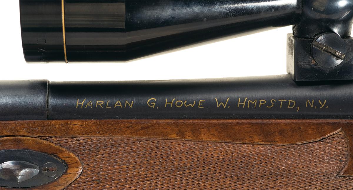 Westley Richards side lever single shot falling block action fitted to a custom barrel marked "HARLAN G. HOWE W. HMPSTD, N.Y." in gold. The barrel was manufactured without sights and the rifle is equipped with a Leupold 3x9 Vari-XII scope with Buehler mounts. Fitted with a jeweled breech block. Mounted on a nicely figured walnut pistol grip stock with rosewood forend cap and grip cap with silver diamond insert, fancy bordered Fleur de Lis checkering, raised shadow-line cheekpiece and checkered metal buttplate.