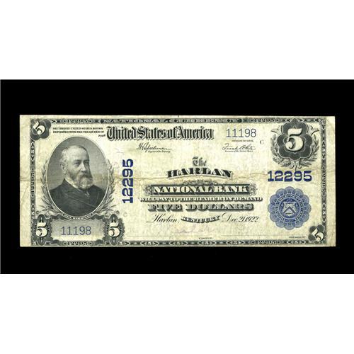 <B>Harlan, KY</B></I> - $5 1902 Plain Back Fr. 609 <B>The Harlan NB</B></I> Ch. # 12295<BR>While grading only <B>Fine+,</B></I> this example bears the highest grade of any of the nine large notes from here listed in the Kelly census.