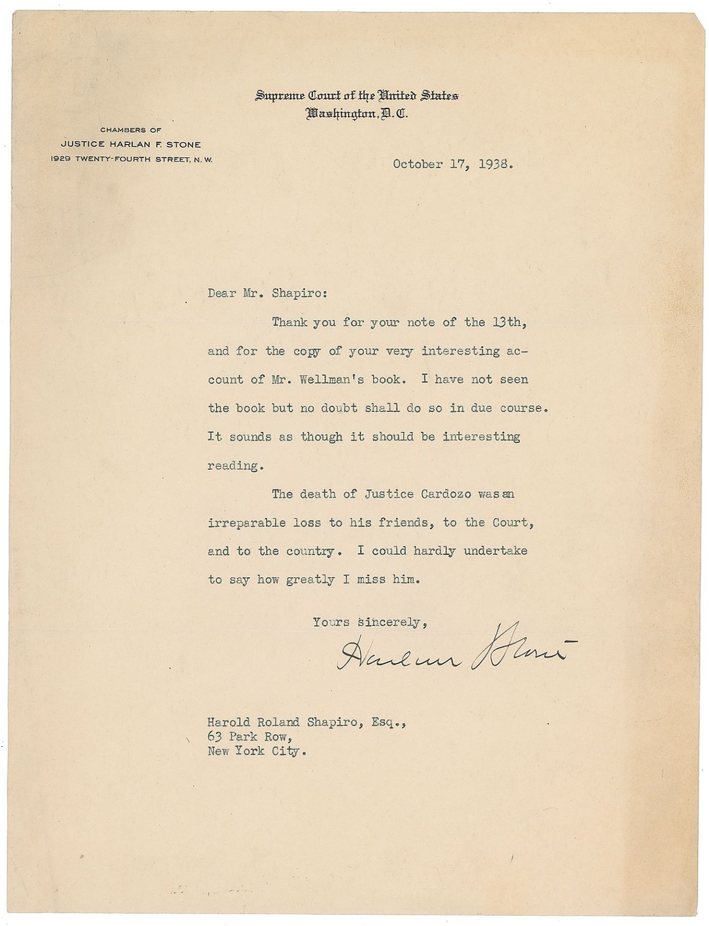 TLS, one page, 8 x 10.5, Supreme Court of the United States letterhead, October 17, 1938. Letter to Harold Roland Shapiro, in full: "Thank you for your note of the 13th, and for the copy of your very interesting account of Mr. Wellman's book. I have not seen the book but no doubt shall do so in due course. It sounds as though it should be interesting reading. The death of Justice Cardozo was an irreparable loss to his friends, to the Court, and to the country. I could hardly undertake to say how greatly I miss him." In fine condition, with light toning along the right edge.