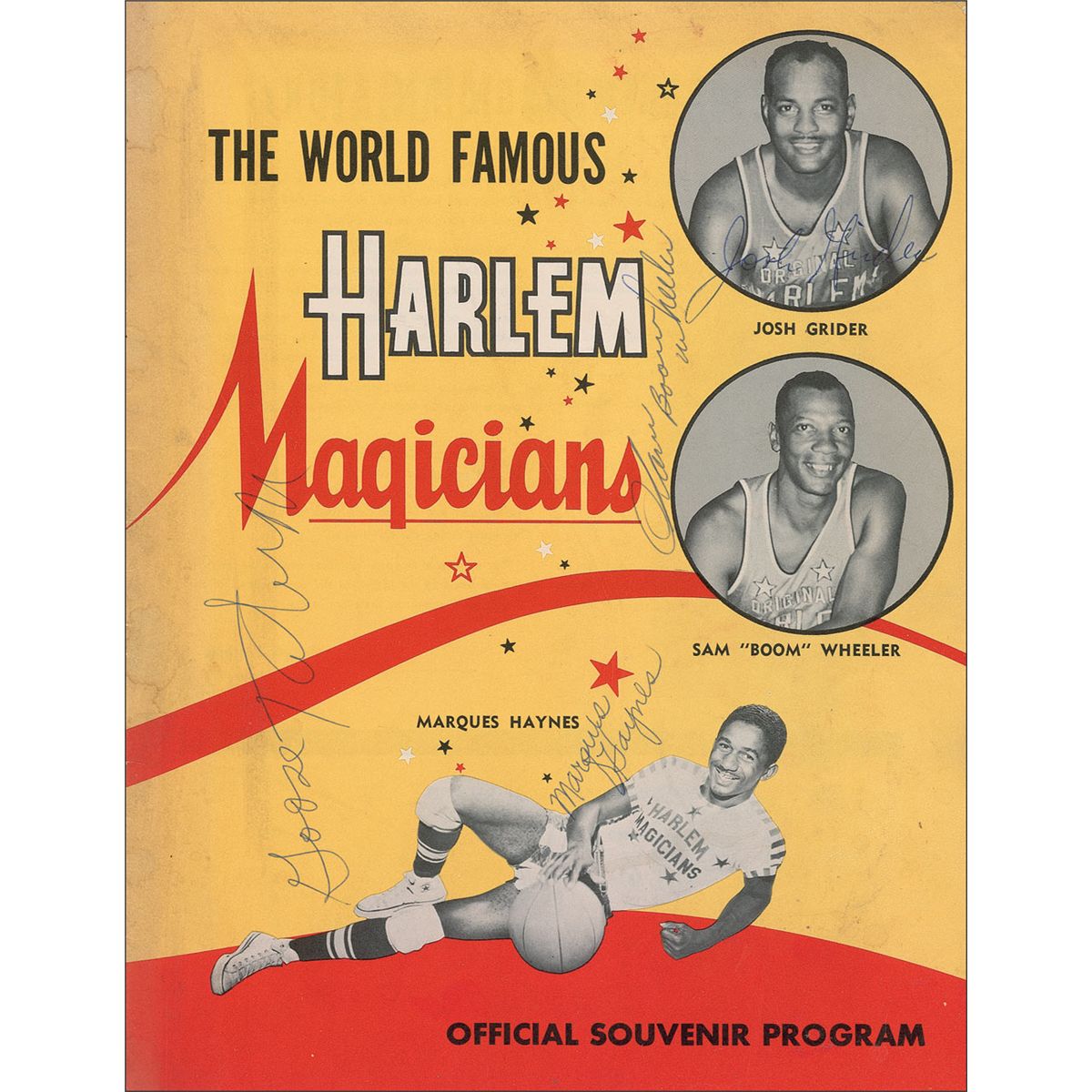 Original souvenir Harlem Magicians game program, 8.5 x 11, signed on the front cover in blue ballpoint by Marques Haynes, Sam ‘Boom’ Wheeler, Josh Grider, and Goose Tatum. In very good condition, with toning, soiling, and damp staining to cover and mild handling wear.