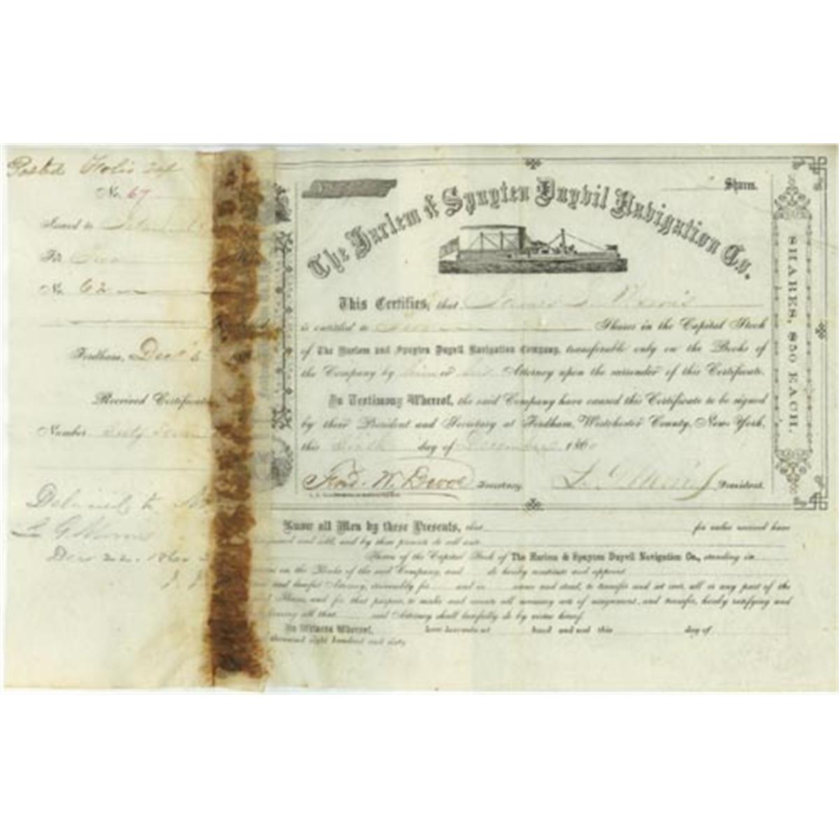 1860's, New York. Stock certificate for. Black. Vignette of small sailing vessel at top center. Printed on a heavy paper. Serious stub glue staining at left margin. Uncancelled and Fine.