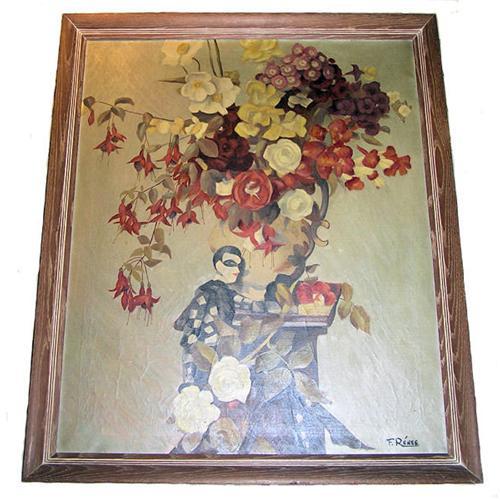 This large modern painting of a harlequin clown and floral bouquet is signed "F RENEE" and dates from the early to mid 20th century. Frame measures 33.75" by 40" by 2". Overall condition is excellent. Some modest degree of craquelure, consistent with age. This painting resides on the upper west side of Manhattan ( New York city ) and may be seen by appointment.