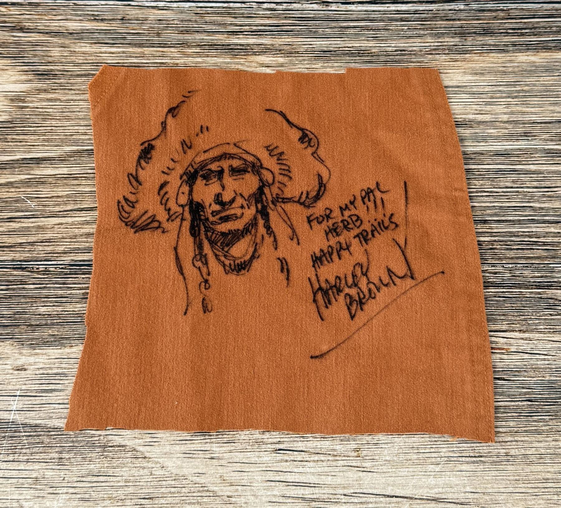 Title is Indian Portrait. Pen and Ink on Velvet. 8" by 8 1/2". Harley W. Brown (Born 1939) is active/lives in Arizona, Alberta / Canada. Harley Brown is known for Portrait and animal painting, ethnic caricature, teaching. A Western painter and sculptor of figures and domestic animals, Harley Brown was born in Edmonton, Alberta, Canada in 1939, and lives in Tucson, Arizona. His father was an amateur artist who encouraged his young son from age seven to pursue art. After graduation from high school, young Brown began doing department store window displays for an impressive $150 a month. Later, he attended the Alberta College of Art in Calgary, supporting himself by selling his drawings door to door, and playing piano professionally. After studying at the Camberwell School of Art in England for two years, Brown began to make a name for himself in Western art, and in 1966, he returned to Canada. Shortly after, Brown met Bob Morgan, curator of the Montana State Historical Society. Morgan put together a one-man show for Brown, where he sold all 70 of his paintings. His career made another leap forward when he received a call from Bob Lougheed to submit some of his work for the National Academy of Western Art show, where he won a gold medal for drawing in 1977. He is a member of the Northwest Rendezvous Artists, Helena, Montana; National Association of Watercolor Artists; Oil Painters of America*; Cowboy Hall of Fame, Oklahoma City, Oklahoma; and Cowboy Artists of America* since 2004. In 2005, he won two gold medals at the CAA annual exhibition. He says of membership in the CAA: "Being allowed to join them is a monumental event in my life." (CA) Brown's work is in the collections of the C. M. Russell Museum; National Cowboy and Western Heritage Museum; and Gene Autry Museum in Los Angeles. Harley Brown was commissioned to paint Prime Minister Winston Churchill, and has painted many portraits of other well-known persons including President Ronald Reagan. His painting media include oil, watercolor and pastel.