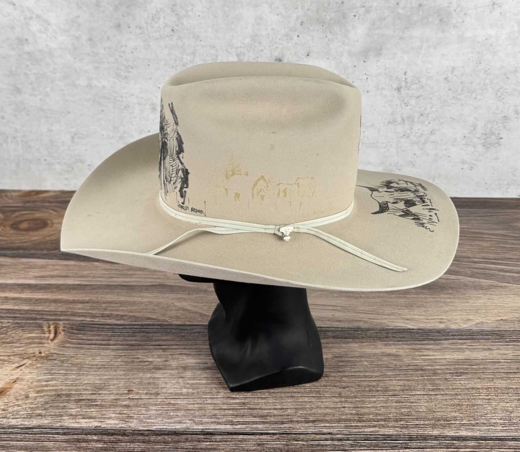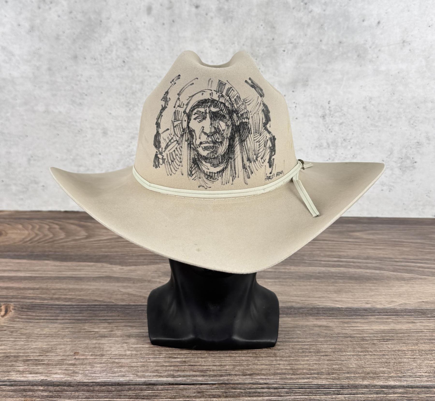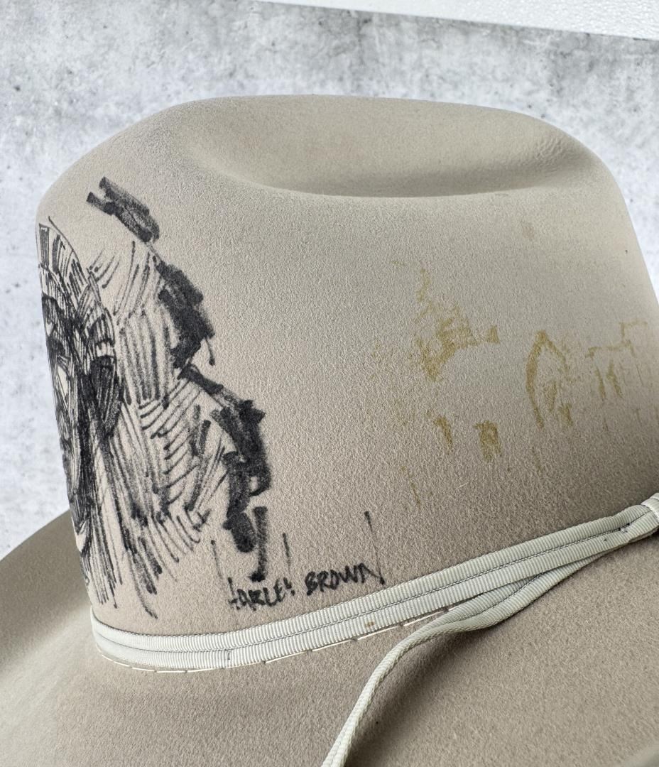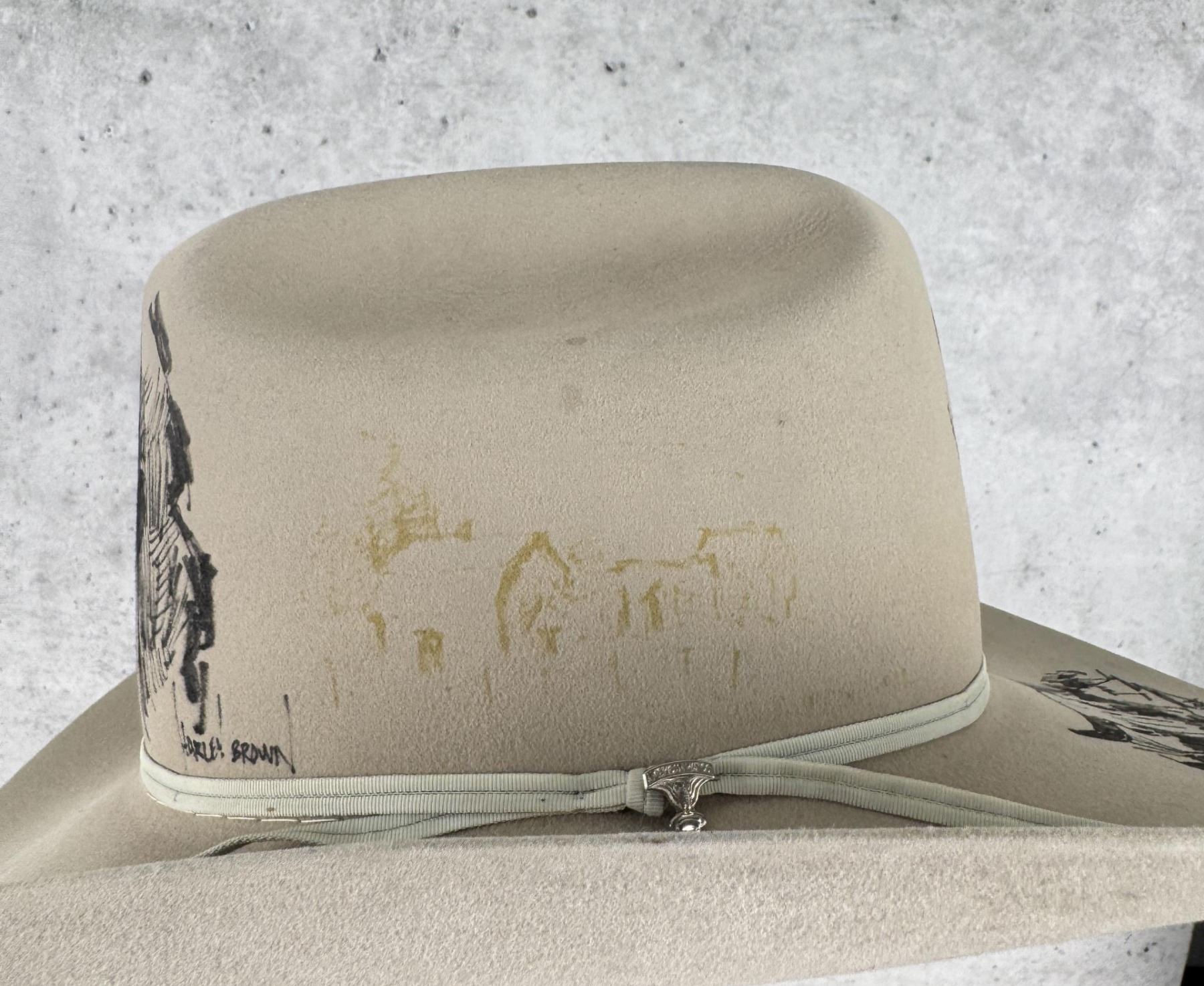 Title is Quick Draw Cowboy Hat. Made by American Hat Co. Size 7 1/8 Harley W. Brown (Born 1939) is active/lives in Arizona, Alberta / Canada. Harley Brown is known for Portrait and animal painting, ethnic caricature, teaching. A Western painter and sculptor of figures and domestic animals, Harley Brown was born in Edmonton, Alberta, Canada in 1939, and lives in Tucson, Arizona. His father was an amateur artist who encouraged his young son from age seven to pursue art. After graduation from high school, young Brown began doing department store window displays for an impressive $150 a month. Later, he attended the Alberta College of Art in Calgary, supporting himself by selling his drawings door to door, and playing piano professionally. After studying at the Camberwell School of Art in England for two years, Brown began to make a name for himself in Western art, and in 1966, he returned to Canada. Shortly after, Brown met Bob Morgan, curator of the Montana State Historical Society. Morgan put together a one-man show for Brown, where he sold all 70 of his paintings. His career made another leap forward when he received a call from Bob Lougheed to submit some of his work for the National Academy of Western Art show, where he won a gold medal for drawing in 1977. He is a member of the Northwest Rendezvous Artists, Helena, Montana; National Association of Watercolor Artists; Oil Painters of America*; Cowboy Hall of Fame, Oklahoma City, Oklahoma; and Cowboy Artists of America* since 2004. In 2005, he won two gold medals at the CAA annual exhibition. He says of membership in the CAA: "Being allowed to join them is a monumental event in my life." (CA) Brown's work is in the collections of the C. M. Russell Museum; National Cowboy and Western Heritage Museum; and Gene Autry Museum in Los Angeles. Harley Brown was commissioned to paint Prime Minister Winston Churchill, and has painted many portraits of other well-known persons including President Ronald Reagan. His painting media include oil, watercolor and pastel.