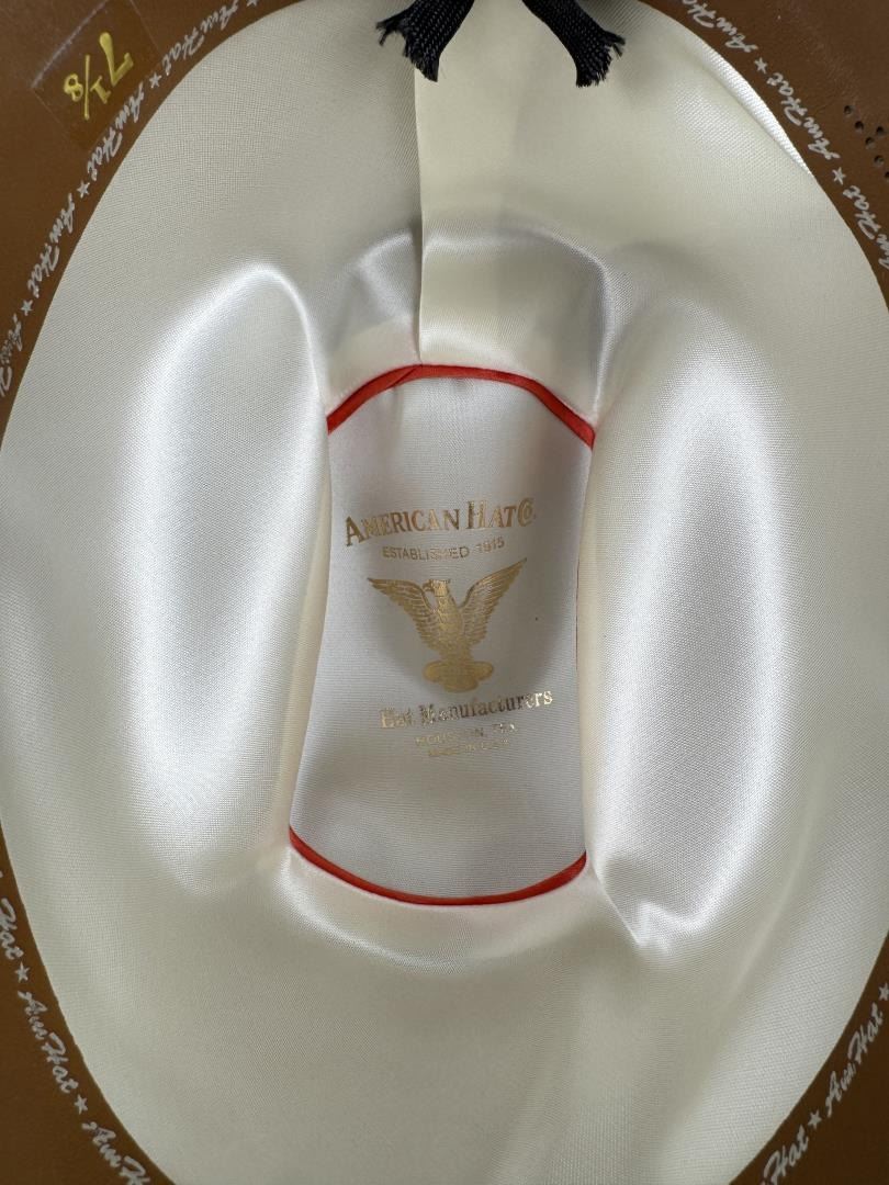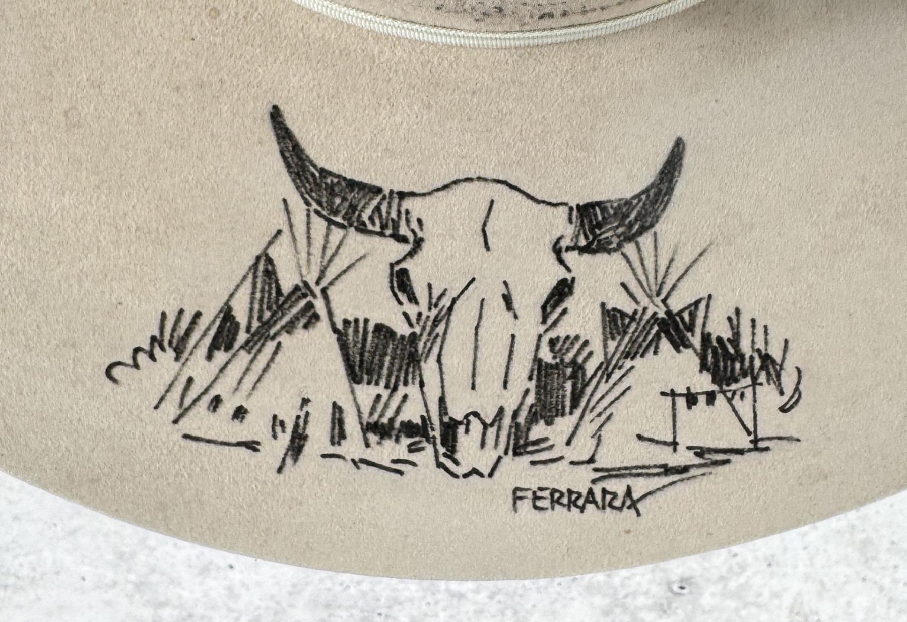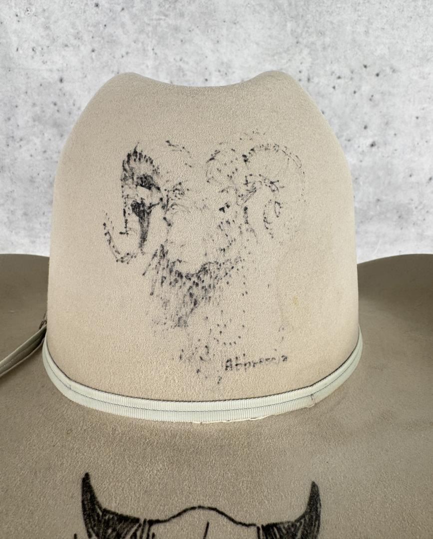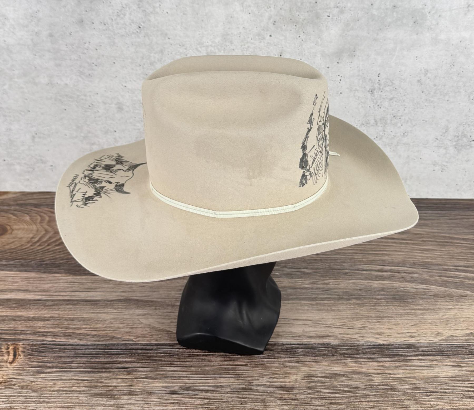 Title is Quick Draw Cowboy Hat. Made by American Hat Co. Size 7 1/8 Harley W. Brown (Born 1939) is active/lives in Arizona, Alberta / Canada. Harley Brown is known for Portrait and animal painting, ethnic caricature, teaching. A Western painter and sculptor of figures and domestic animals, Harley Brown was born in Edmonton, Alberta, Canada in 1939, and lives in Tucson, Arizona. His father was an amateur artist who encouraged his young son from age seven to pursue art. After graduation from high school, young Brown began doing department store window displays for an impressive $150 a month. Later, he attended the Alberta College of Art in Calgary, supporting himself by selling his drawings door to door, and playing piano professionally. After studying at the Camberwell School of Art in England for two years, Brown began to make a name for himself in Western art, and in 1966, he returned to Canada. Shortly after, Brown met Bob Morgan, curator of the Montana State Historical Society. Morgan put together a one-man show for Brown, where he sold all 70 of his paintings. His career made another leap forward when he received a call from Bob Lougheed to submit some of his work for the National Academy of Western Art show, where he won a gold medal for drawing in 1977. He is a member of the Northwest Rendezvous Artists, Helena, Montana; National Association of Watercolor Artists; Oil Painters of America*; Cowboy Hall of Fame, Oklahoma City, Oklahoma; and Cowboy Artists of America* since 2004. In 2005, he won two gold medals at the CAA annual exhibition. He says of membership in the CAA: "Being allowed to join them is a monumental event in my life." (CA) Brown's work is in the collections of the C. M. Russell Museum; National Cowboy and Western Heritage Museum; and Gene Autry Museum in Los Angeles. Harley Brown was commissioned to paint Prime Minister Winston Churchill, and has painted many portraits of other well-known persons including President Ronald Reagan. His painting media include oil, watercolor and pastel.