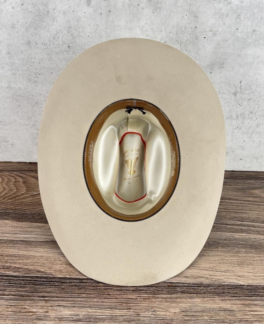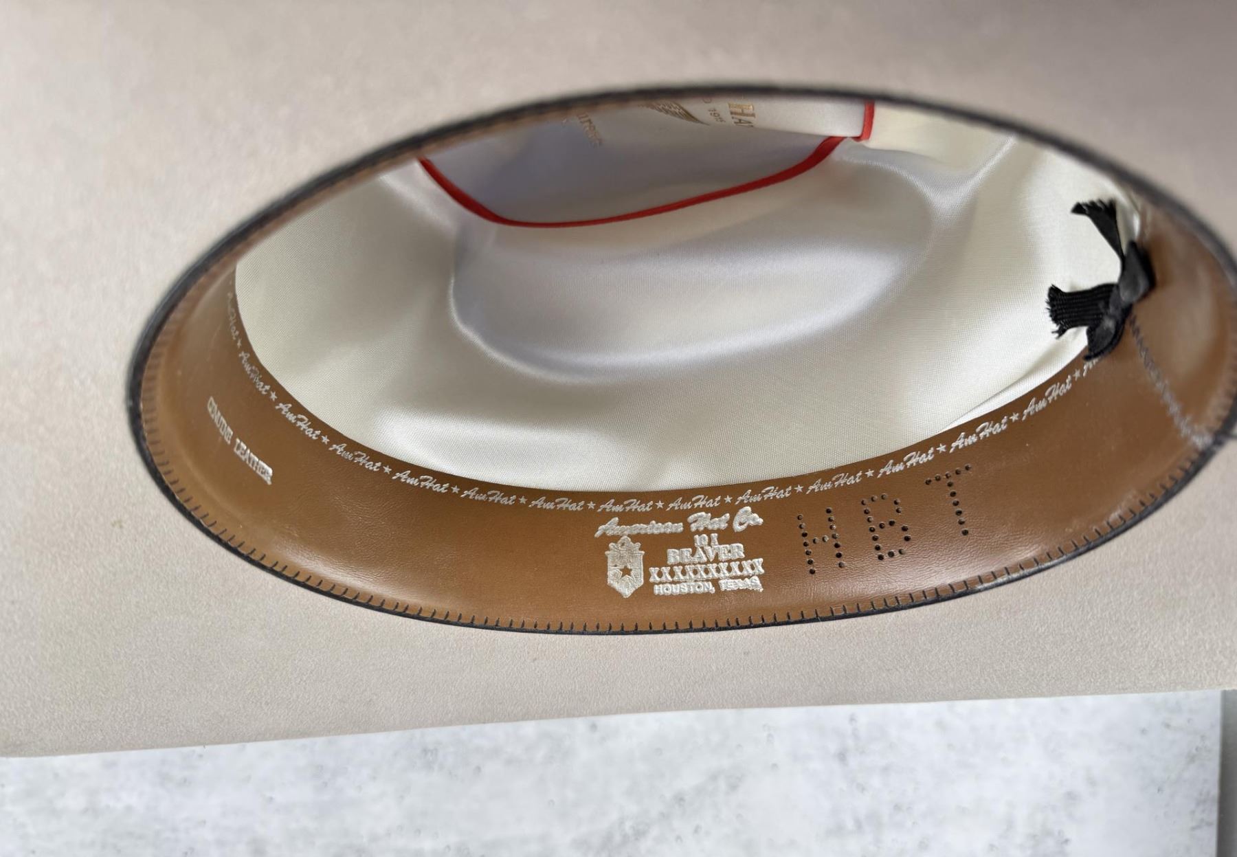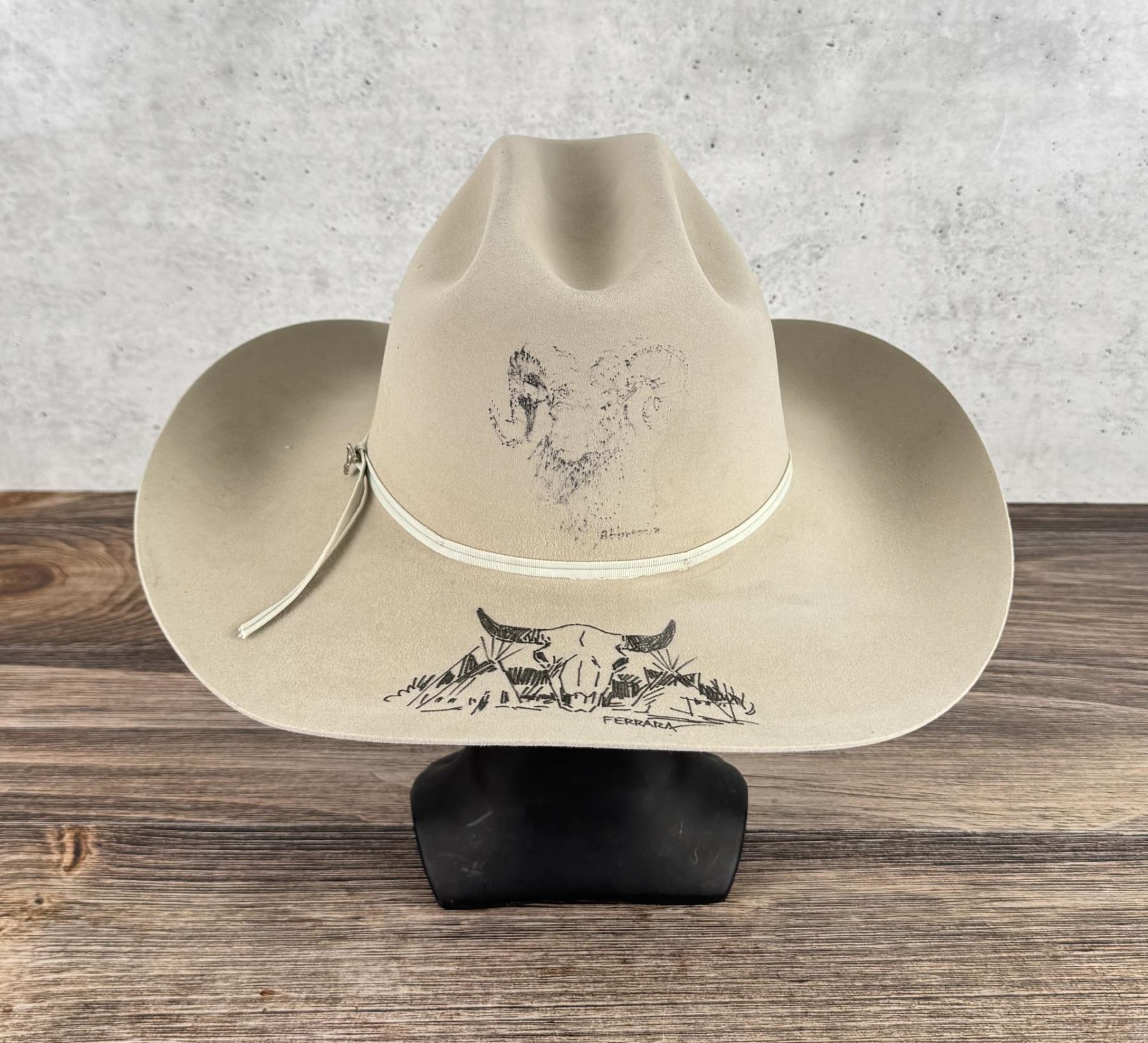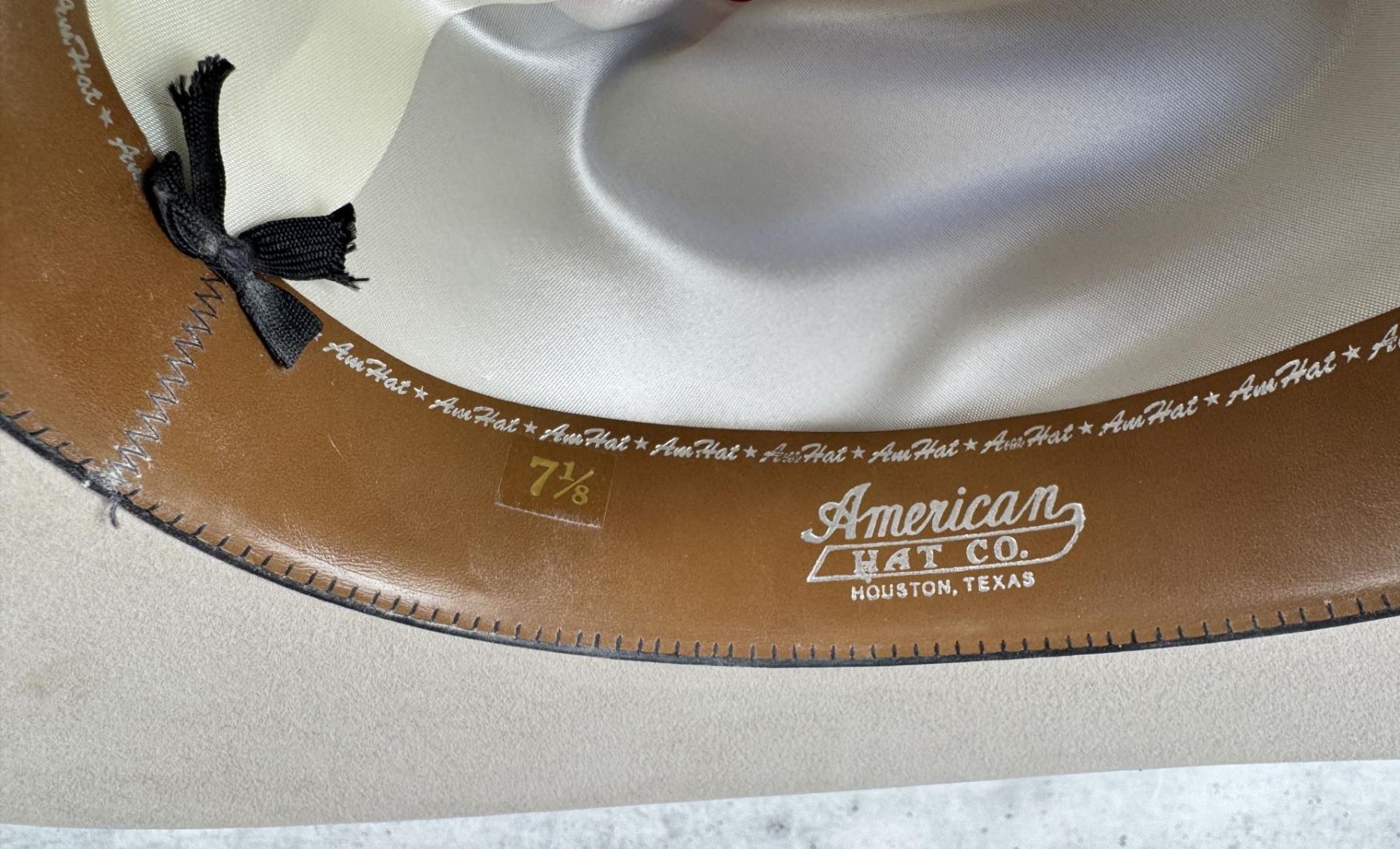 Title is Quick Draw Cowboy Hat. Made by American Hat Co. Size 7 1/8 Harley W. Brown (Born 1939) is active/lives in Arizona, Alberta / Canada. Harley Brown is known for Portrait and animal painting, ethnic caricature, teaching. A Western painter and sculptor of figures and domestic animals, Harley Brown was born in Edmonton, Alberta, Canada in 1939, and lives in Tucson, Arizona. His father was an amateur artist who encouraged his young son from age seven to pursue art. After graduation from high school, young Brown began doing department store window displays for an impressive $150 a month. Later, he attended the Alberta College of Art in Calgary, supporting himself by selling his drawings door to door, and playing piano professionally. After studying at the Camberwell School of Art in England for two years, Brown began to make a name for himself in Western art, and in 1966, he returned to Canada. Shortly after, Brown met Bob Morgan, curator of the Montana State Historical Society. Morgan put together a one-man show for Brown, where he sold all 70 of his paintings. His career made another leap forward when he received a call from Bob Lougheed to submit some of his work for the National Academy of Western Art show, where he won a gold medal for drawing in 1977. He is a member of the Northwest Rendezvous Artists, Helena, Montana; National Association of Watercolor Artists; Oil Painters of America*; Cowboy Hall of Fame, Oklahoma City, Oklahoma; and Cowboy Artists of America* since 2004. In 2005, he won two gold medals at the CAA annual exhibition. He says of membership in the CAA: "Being allowed to join them is a monumental event in my life." (CA) Brown's work is in the collections of the C. M. Russell Museum; National Cowboy and Western Heritage Museum; and Gene Autry Museum in Los Angeles. Harley Brown was commissioned to paint Prime Minister Winston Churchill, and has painted many portraits of other well-known persons including President Ronald Reagan. His painting media include oil, watercolor and pastel.
