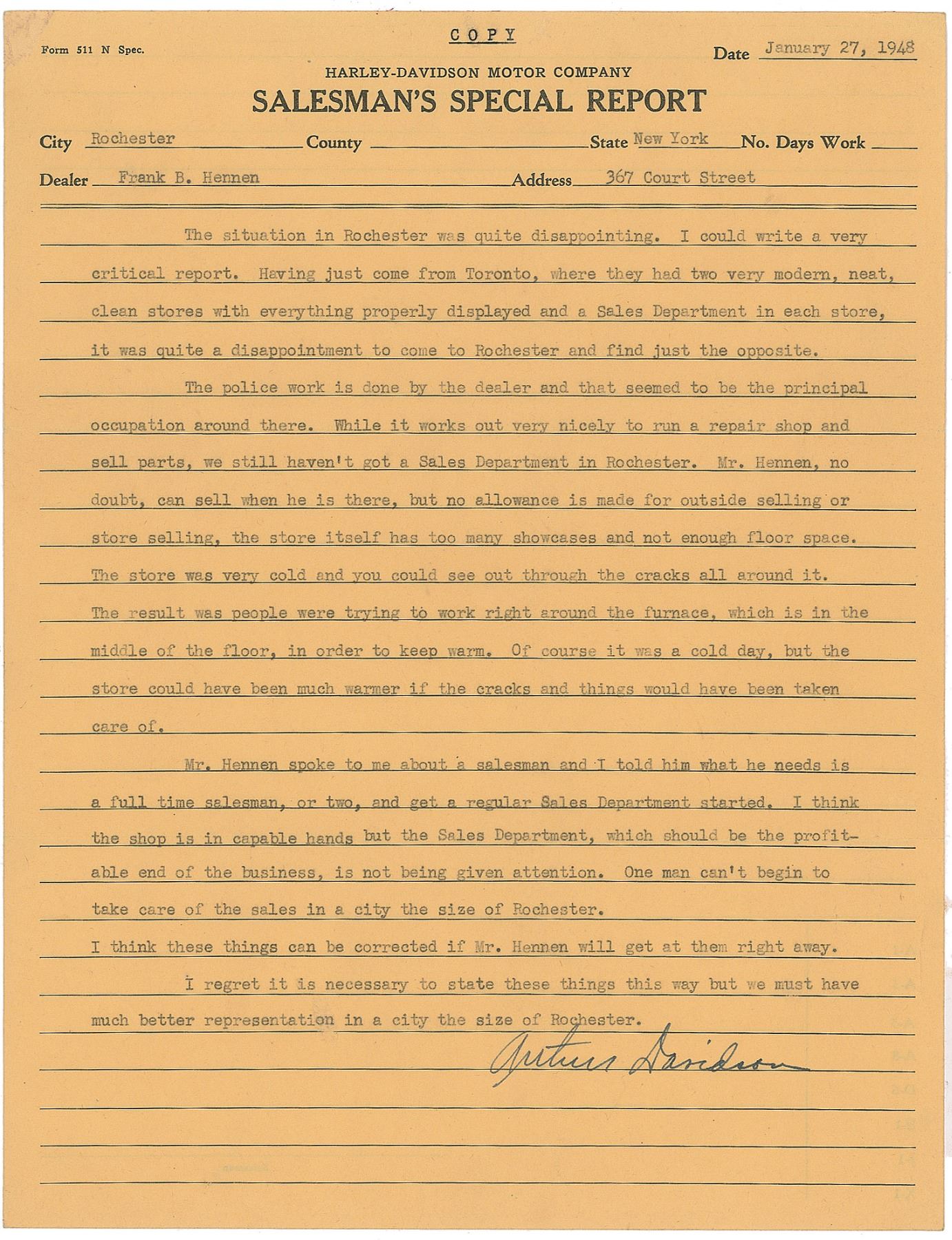 DS, one page, 8.25 x 10.75, January 27, 1948. A "Salesman's Special Report" for the dealer Frank B. Hennen in Rochester, New York. In part: "The situation in Rochester was quite disappointing. I could write a very critical report. Having just come from Toronto, where they had two very modern, neat, clean stores with everything properly displayed and a Sales Department in each store, it was quite a disappointment to come to Rochester and find just the opposite…. Mr. Henne, no doubt, can sell when he is there, but no allowance is made for outside selling or store selling, the store itself has too many showcases and not enough floor space. The store was very cold and you could see out through the cracks all around it. The result was people were trying to work right around the furnace, which is in the middle of the floor, in order to keep warm…. I think the shop is in capable hands but the Sales Department, which should be the profitable end of the business, is not being given attention. One man can't begin to take care of the sales in a city the size of Rochester." in fine condition.