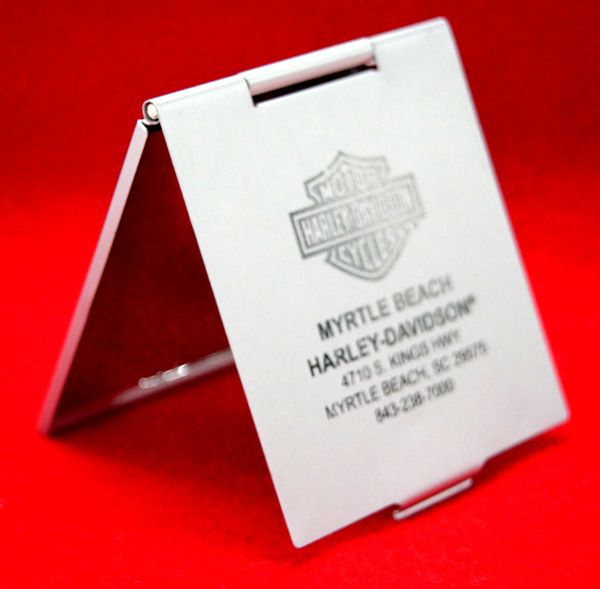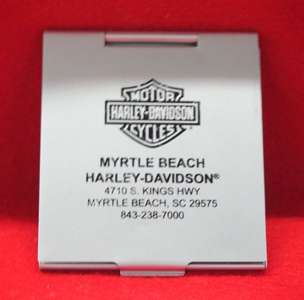 Harley-Davidson Collectible Ladies Compact Mirror, measures 3 1/8''L x 2.75''W closed and 6 1/8''L open, top of compact has Harley Logo and reads ''Myrtle Beach Harley-Davidson 4710 S. Kings Hwy Myrtle Beach SC 29575 843-238-7000''