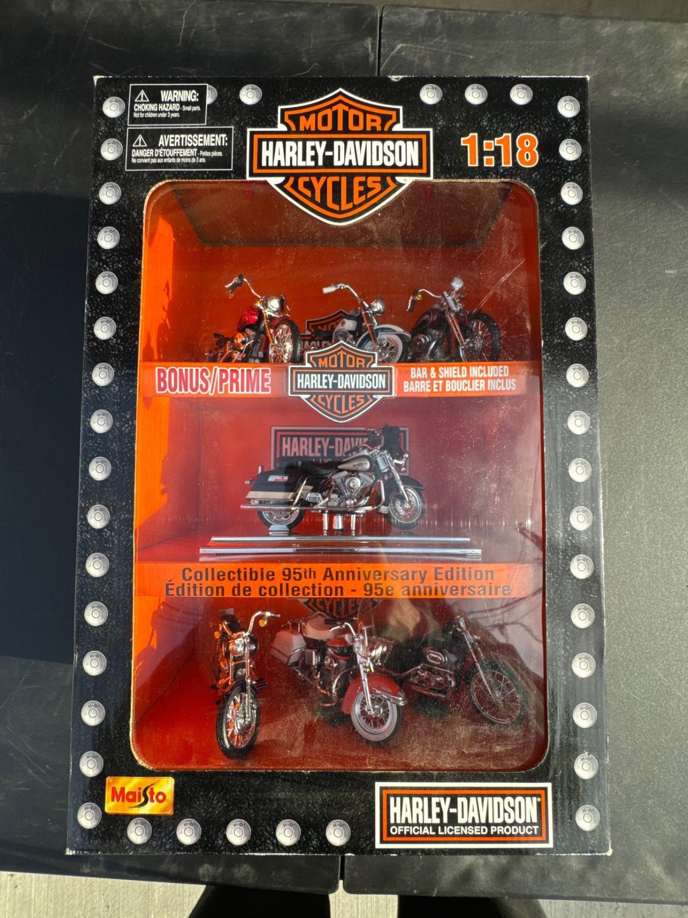 Harley Davidson one eighteenth scale ninety fifth anniversary edition collection, collectible Harley toys.