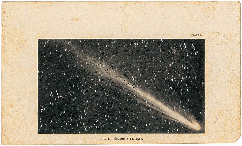 American astronomer (1885–1972) who measured the size of the galaxy, finding it was far bigger than previously thought. Book plate of a comet, titled “Fig. 1. Nov 15, 1908,” 10 x 6, signed and inscribed in black ink starting in the light portion of the comet’s tail, “Harlow Shapley, by suggestion of Marion Colvin Deane, February 1930.” In very good condition, with scattered foxing to borders and poor contrast to inscription and date.