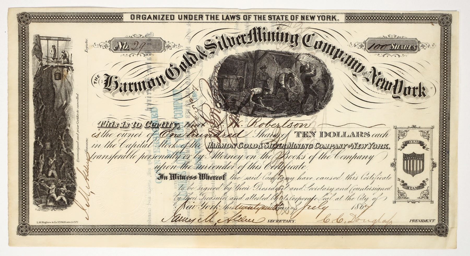 Possibly Colorado. Not listed by Hollister. Not in Filer or other Holabird indexes. No articles found on CHNC. Articles on newspapers.com only mention share sales, but don't give the location. We have listed for a company of the same name that operated in Placerville, El Dorado County, California in 1864 but with different corp. signatures and inc. date. (There is a Harmon Group of mines at Placerville). We could not definitively locate at this time. Inc. in New York, 1866. No. 29, issued for 100 shares to Robertson in 1867 in New York. Signed by president C.C. Douglap and the secretary. Pen cancelled. Black border and print with two different mining vignettes. Printed by LH Biglow & Co., NY. Folds, creases. 6 x 11.5"