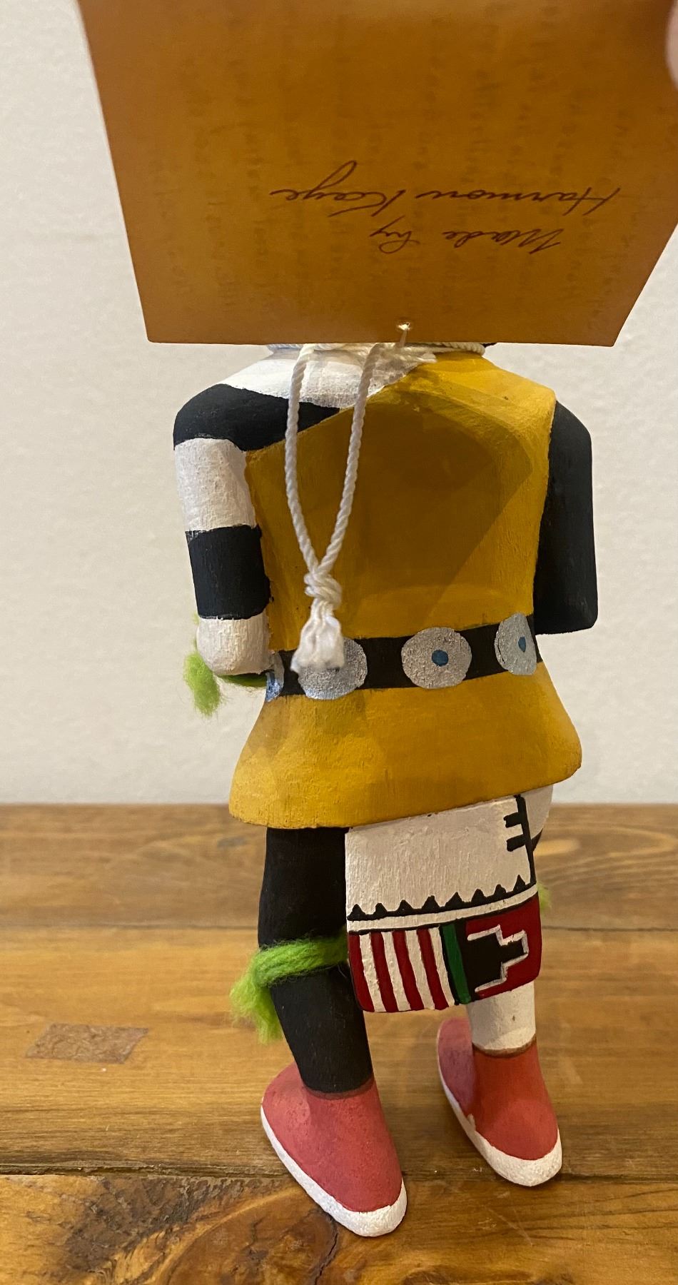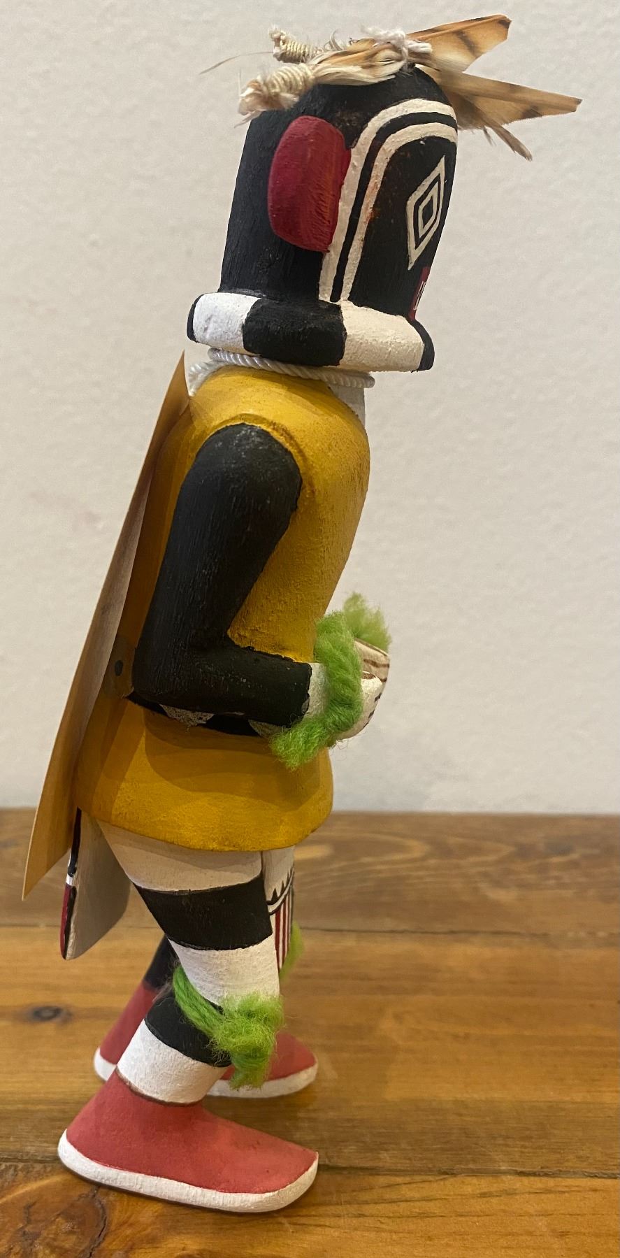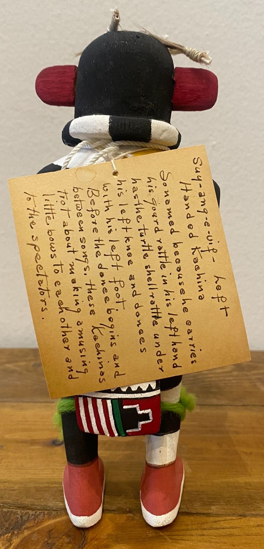 It appears and reading the card this Katsina should be carrying a gourd rattle in his left hand. It appears that both hands had something in the hand at one time. Consignor thought that they collected this piece in the 1970s.