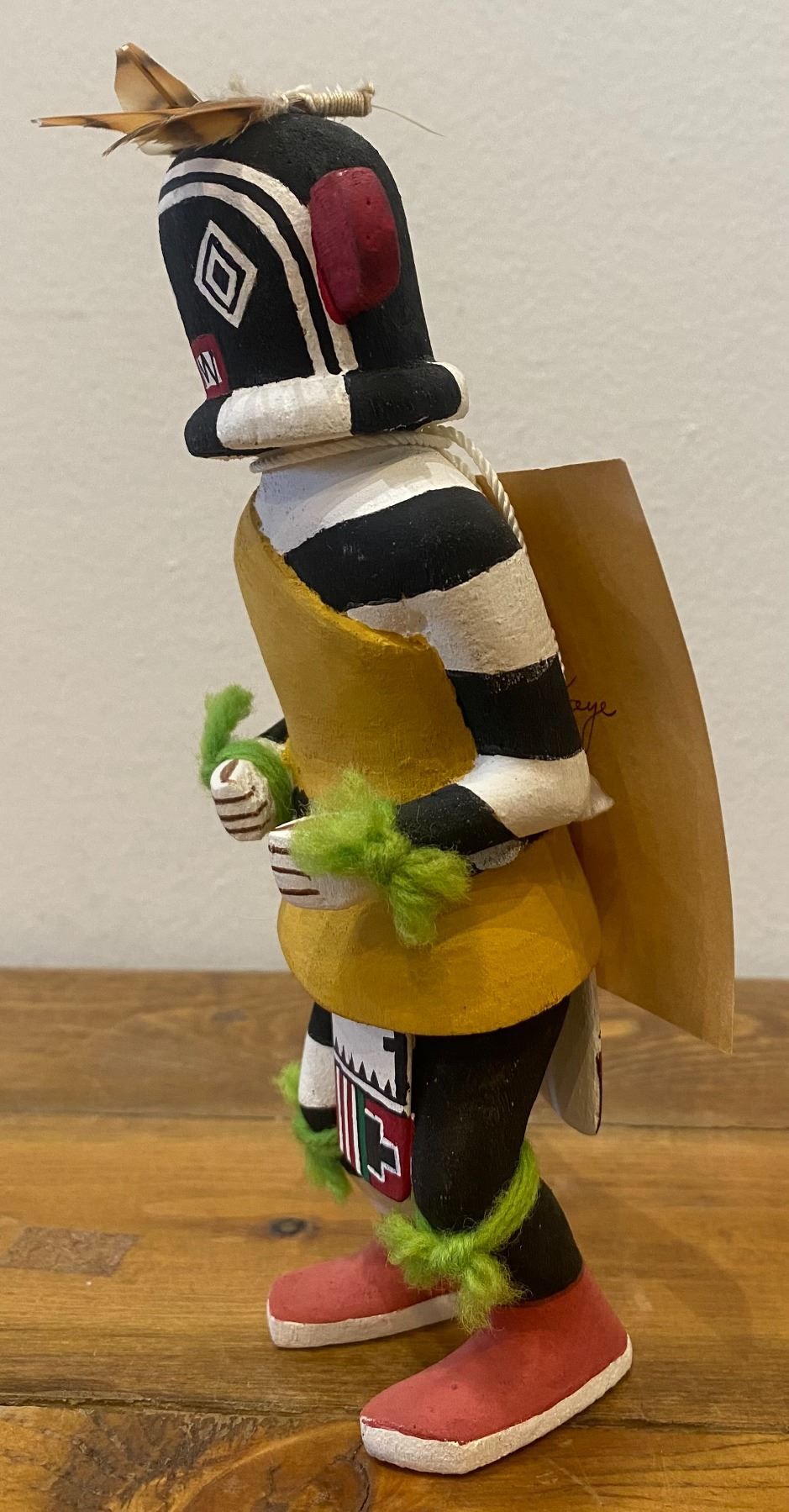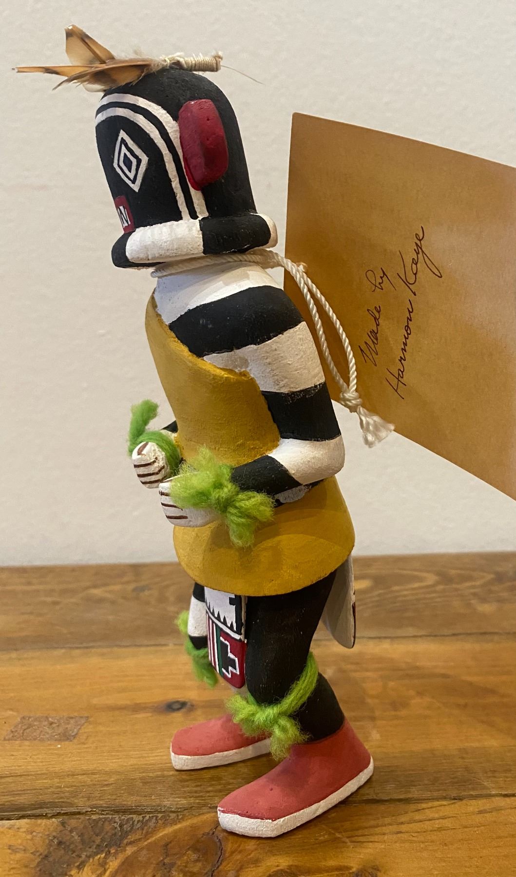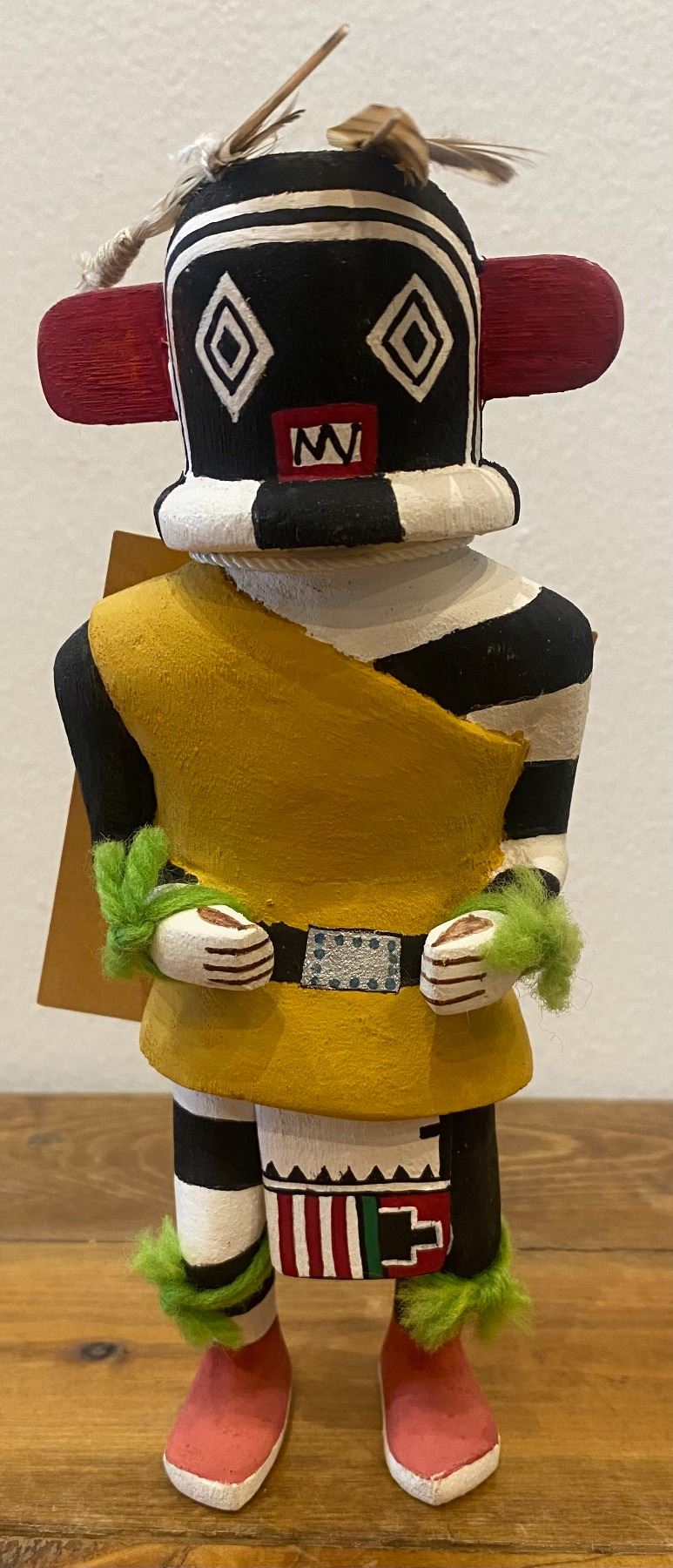 It appears and reading the card this Katsina should be carrying a gourd rattle in his left hand. It appears that both hands had something in the hand at one time. Consignor thought that they collected this piece in the 1970s.