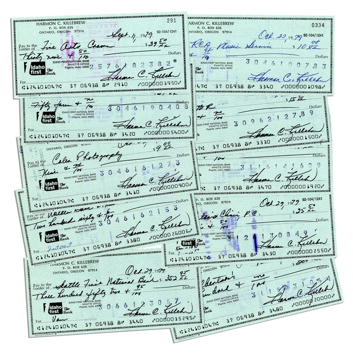 Lot of 10 personal checks signed by Harmon Killebrew. The HOFer and spectacular power hitter signs ''Harmon Killebrew'' to each check, which are all made out entirely in his hand. Checks are dated 1979, when Killebrew worked as a broadcaster for the Minnesota Twins following his dazzling playing career on the team. Killebrew's name and PO Box is printed to the upper left. Each measures 6'' x 2.75''. Standard bank cancellations; near fine.